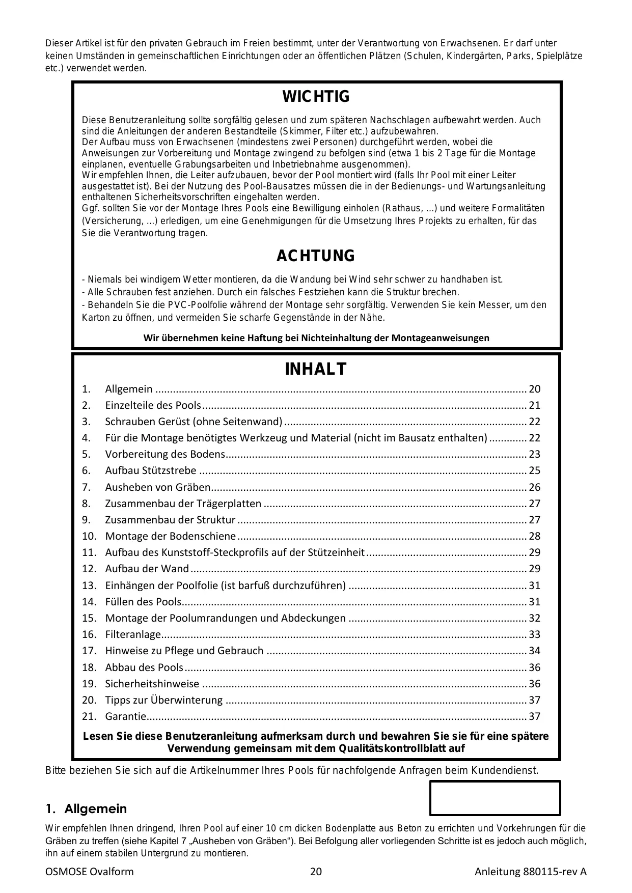 21. Garantie. Sachet visserie sangle 0106.PACK de votre piscine Ecrou M8 0623 27 Vis tête hexagonale M8x20 0923 27 Votre piscine est exclusivement destinée à être posée sur le sol