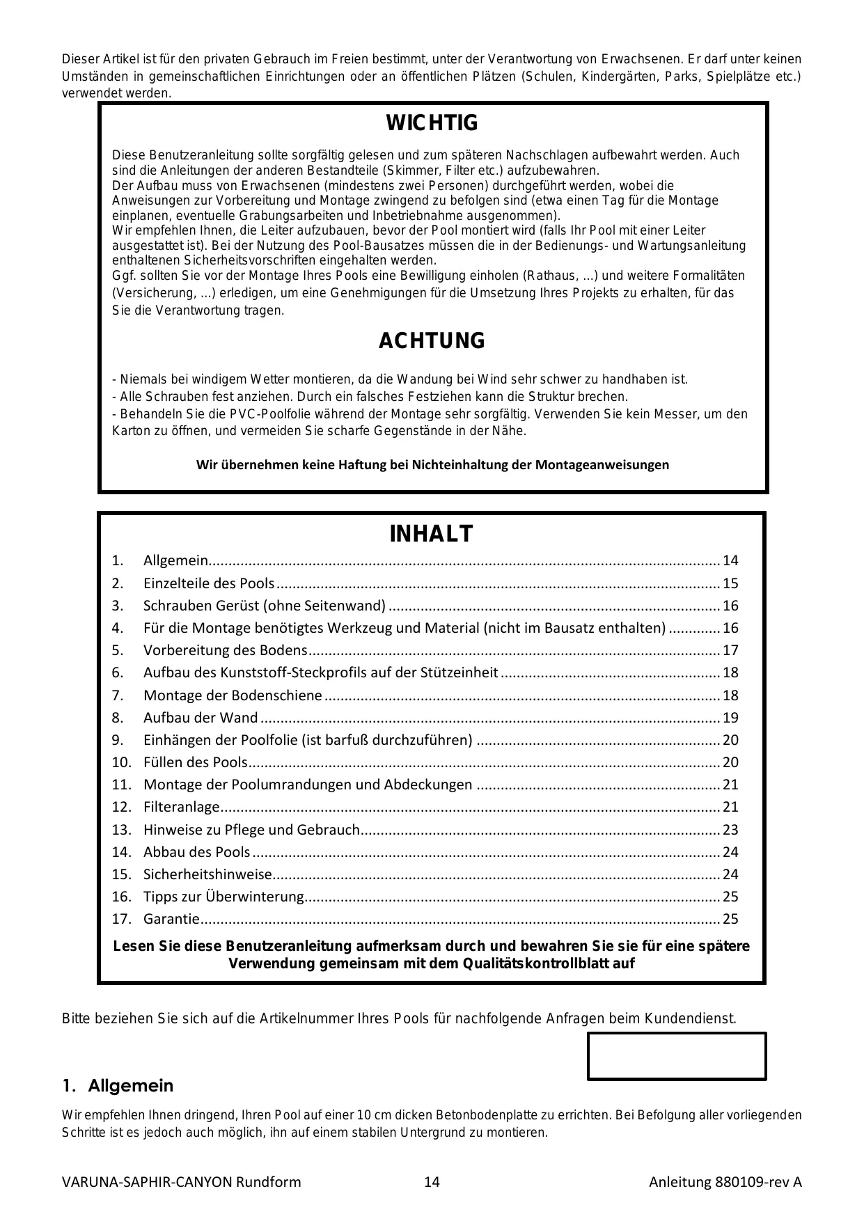 10. Llenado de la piscina.. 11. Instalaciôn de los bordes perimetrales y piezas de recubrimiento.. 12. Filtracién… 13. Consejos de mantenimiento y utilizacién.. 14. Desmontaje de la piscina.… 15. Consejos de seguridad… 16. Consejos para la hibernaciôn…. 17. Garantia …