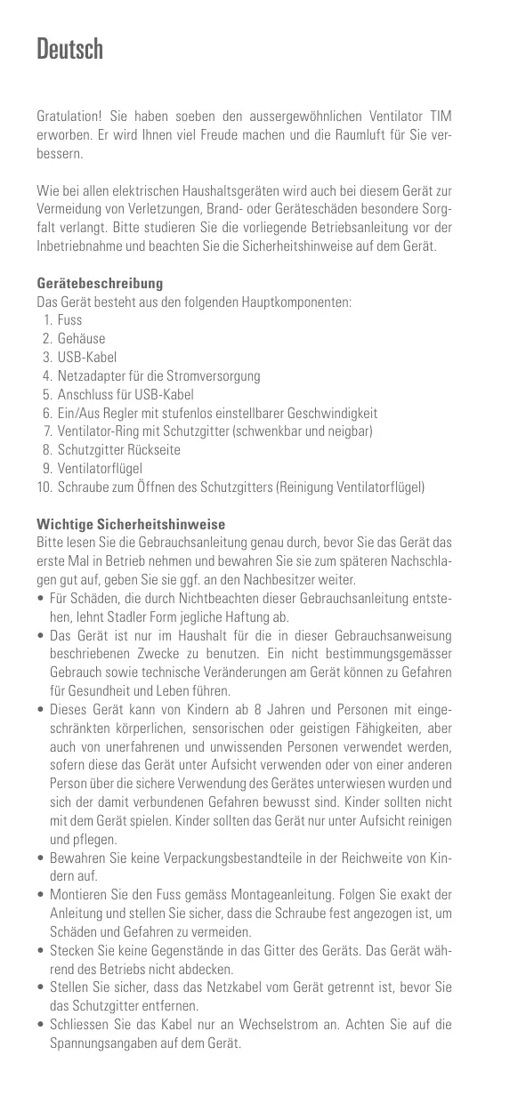 Wichtige Sicherheîtshinweise Bitte lesen Sie die Gebrauchsanleitung genau durch, bevor Sie das Gerät das erste Mal in Betrieb nehmen und bewahren Sie sie zum späteren Nachschla- gen gut auf, geben Sie sie ggf. an den Nachbesitzer weiter. + Für Schäden, die durch Nichtbeachten dieser Gebrauchsanleitung entste- hen, lehnt Stadier Form jegliche Haftung ab. + Das Gerät ist nur im Haushalt für die in dieser Gebrauchsanweisung beschriebenen Zwecke zu benutzen. Ein nicht bestimmungsgemässer Gebrauch sowie technische Veränderungen am Gerät kännen zu Gefahren für Gesundheit und Leben führen. Dieses Gerät kann von Kinder ab 8 Jahren und Personen mit einge- schränkten Kürperlichen, sensorischen oder geistigen Fähigkeiten, aber auch von unerfahrenen und unwissenden Personen verwendet werden, sofemn diese das Gerät unter Aufsicht verwenden oder von einer anderen Person über die sichere Verwendung des Gerätes unterwiesen wurden und sich der damit verbundenen Gefahren bewusst sind. Kinder sollten nicht mit dem Gerät spielen. Kinder sollten das Gerät nur unter Aufsicht reinigen und pflegen. Bewahren Sie keine Verpackungsbestandteile in der Reichweïte von Kin- dern auf. Montieren Sie den Fuss gemäss Montageanleitung. Folgen Sie exakt der Anleitung und stellen Sie sicher, dass die Schraube fest angezogen ist, um Schäden und Gefahren zu vermeiden: Stecken Sie keine Gegenstände in das Gitter des Geräts. Das Gerät wäh- rend des Betriebs nicht abdecken + Stellen Sie sicher, dass das Netzkabel vom Gerät getrennt ist, bevor Sie das Schutzgitter entfernen. + Schliessen Sie das Kabel nur an Wechselstrom an. Achten Sie auf die Spannungsangaben auf dem Gerät.