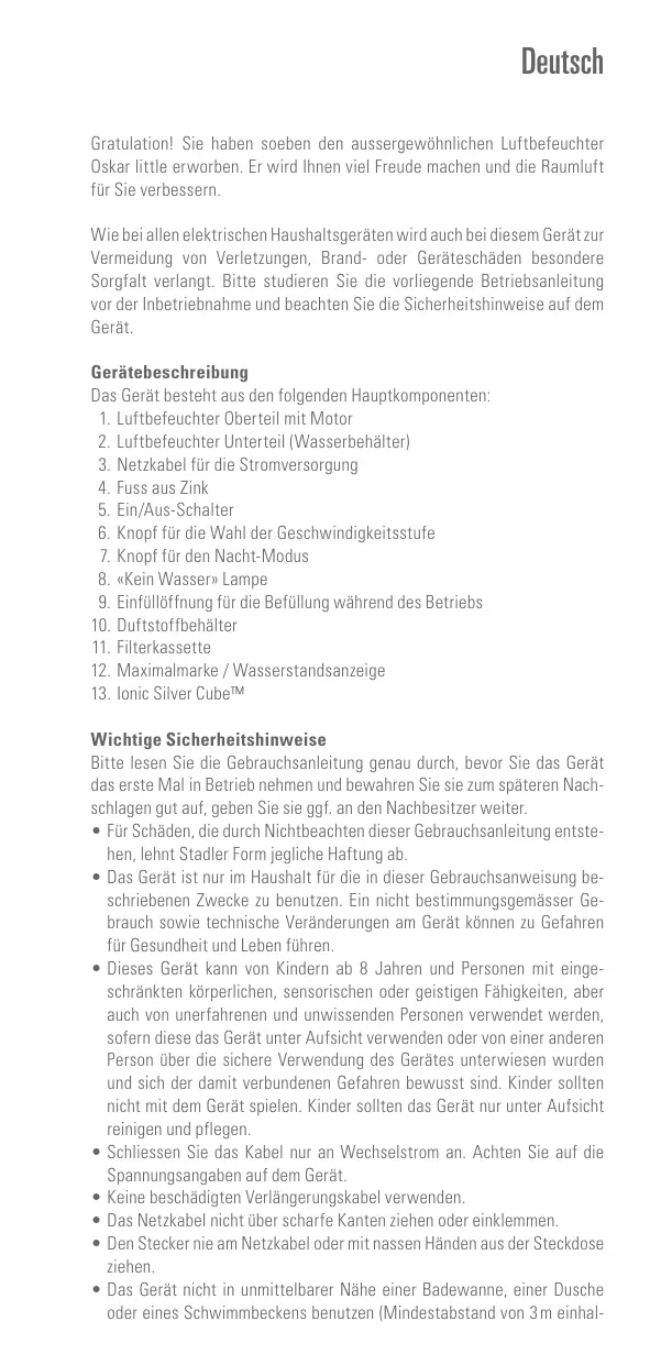 - Für Schäden, die durch Nichtbeachten dieser Gebrauchsanleitung entstehen, lehtn Stadler Form jegliche Haftung ab.