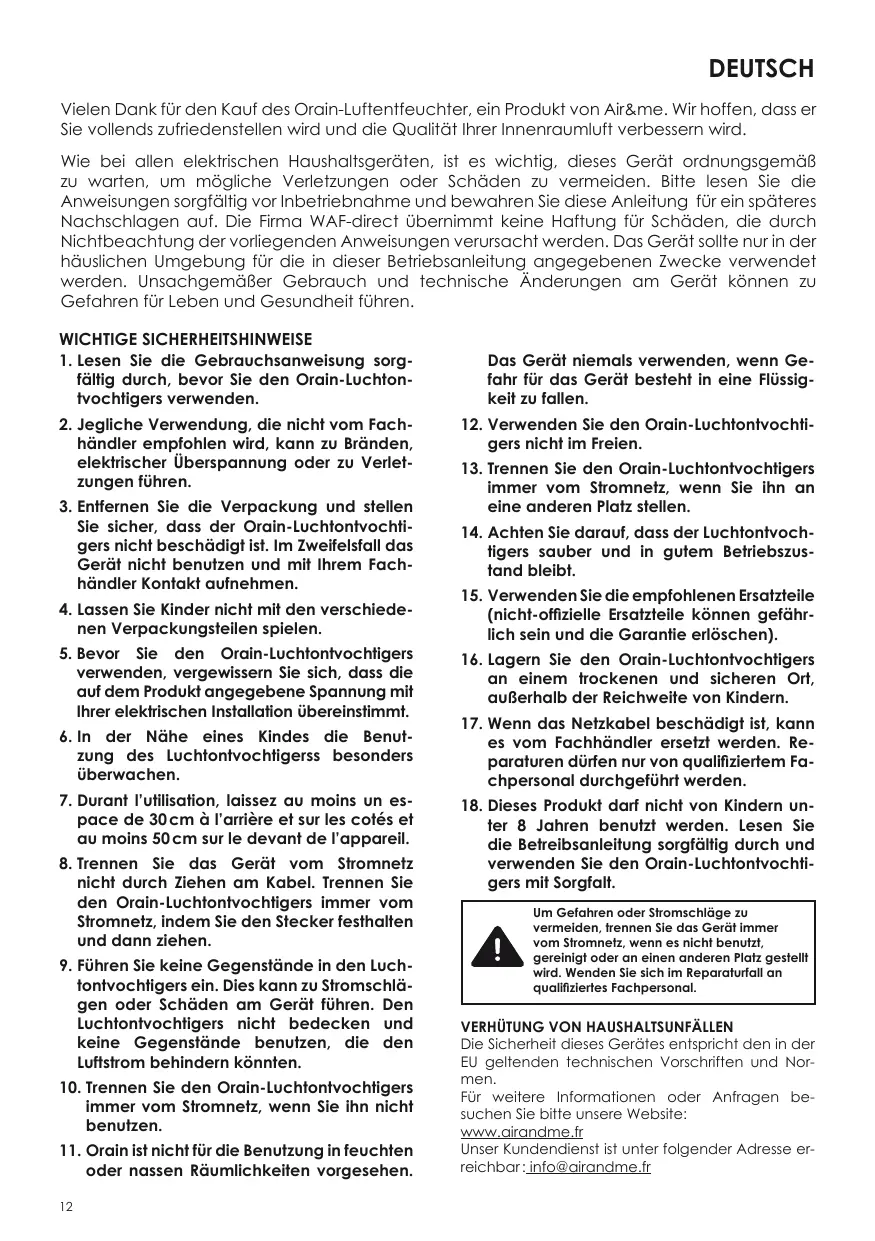 DEUTSCH Vielen Dank für den Kauf des Orain-Luftentfeuchter, ein Produkt von Air&me. Wir hoffen, dass er Sie vollendis zufriedenstellen wird und die Qualität Inrer Innenraumiluft verbessern wird