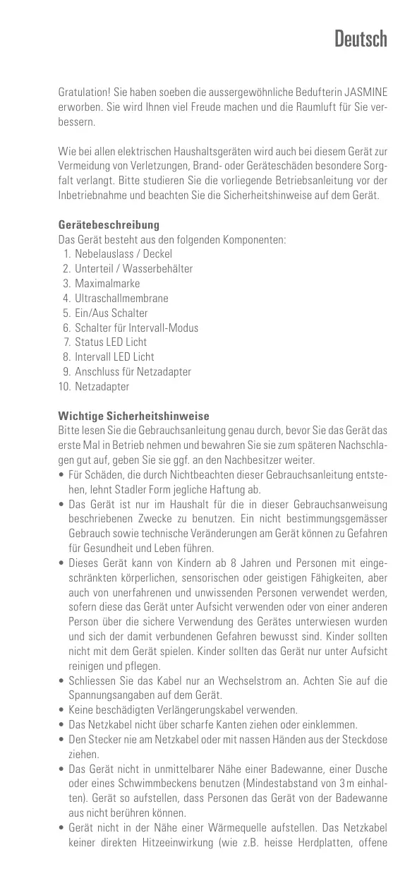 BEDIENUNGSANLEITUNG JASMINE TITANIUM STADLERFORM