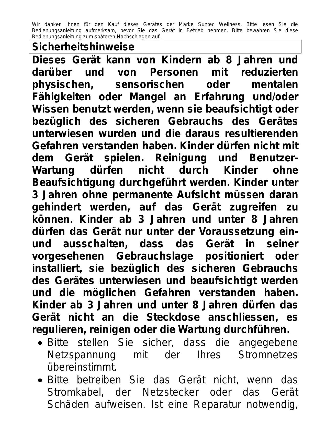BEDIENUNGSANLEITUNG Wir danken Ihnen für den Kauf dieses Gerâtes der Marke Suntec Wellness. Bitte lesen Sie die Bedienungsanleitung aufmerksam, bevor Sie das Gerät in Betrieb nehmen. Bitte bewahren Sie diese Bedienungsanleitung zum späteren Nachschlagen auf.