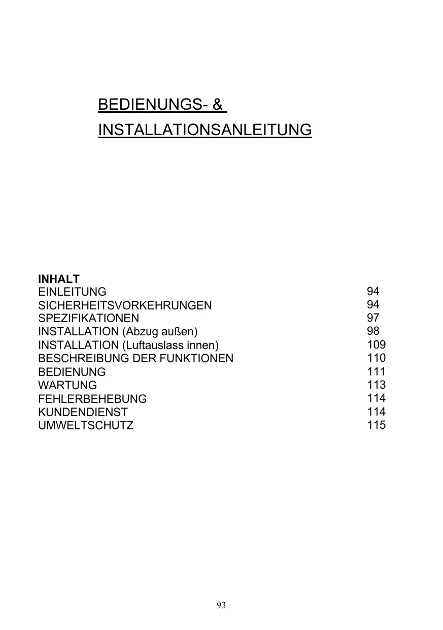 BEDIENUNGS- & INSTALLATIONSANLEITUNG INHALT EINLEITUNG SICHERHEITSVORKEHRUNGEN SPEZIFIKATIONEN INSTALLATION (Abzug auRen) INSTALLATION (Luftauslass innen)