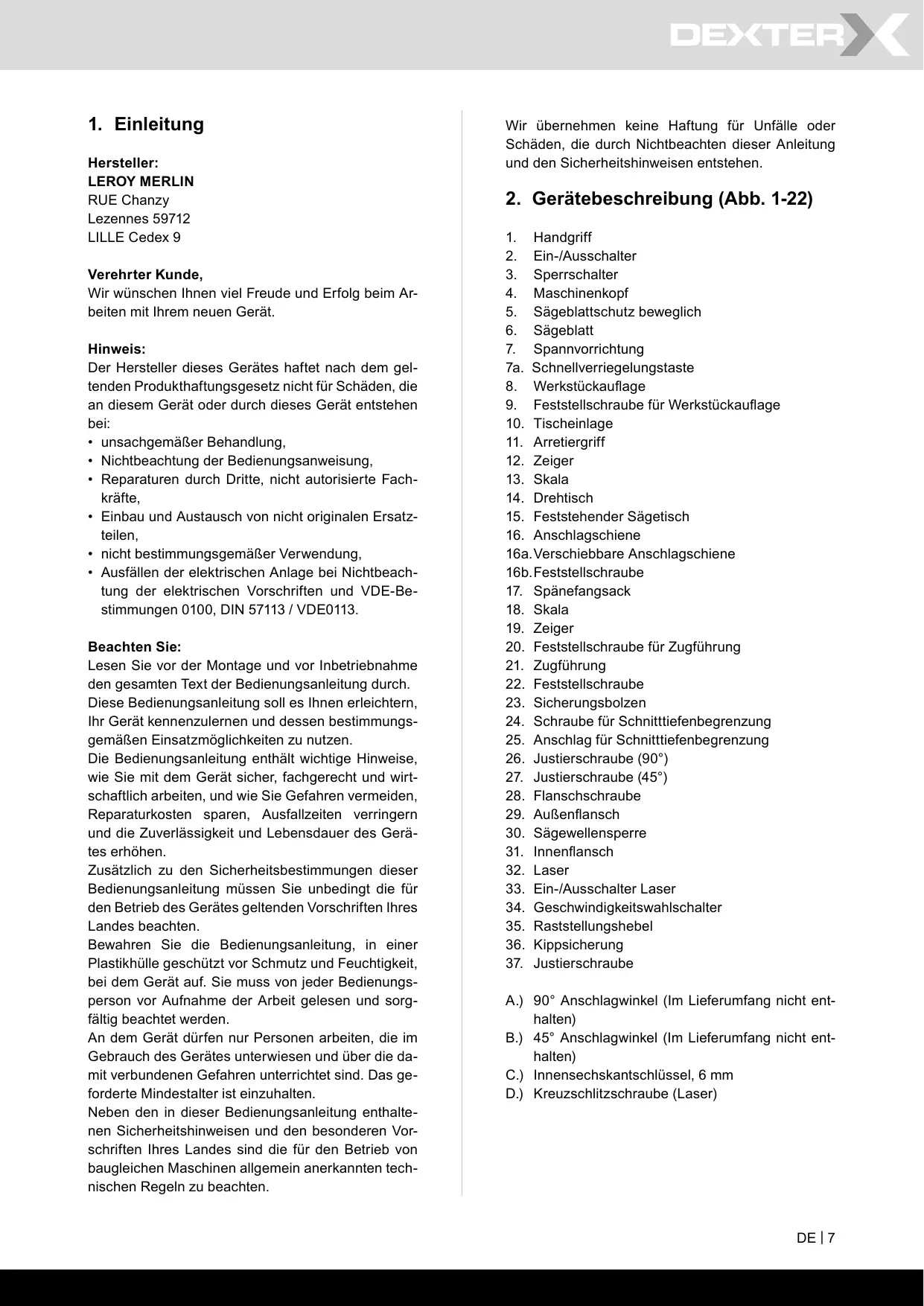 DX254 - Gehrungssäge DEXTER - Kostenlose Bedienungsanleitung