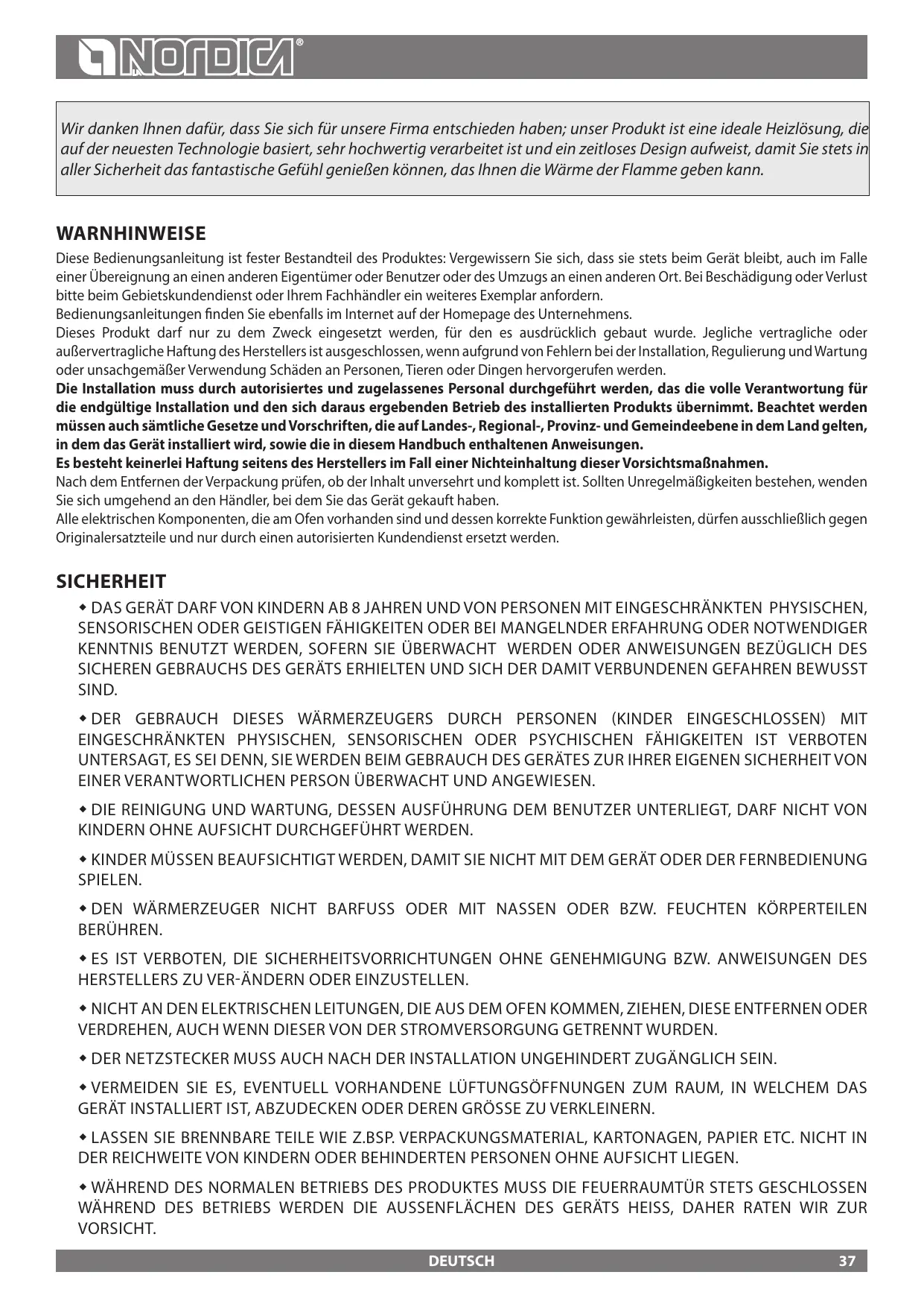 Faites contrôler par votre ramoneur de zone l'installation de la cheminée, le raccordement et l'aération. IMPORTANT: ENTRETIEN ET SOIN QUI NE PEUT AVOIR LIEU QU'AVEC L'APPAREIL FROID. Utiliser exclusivement des pièces de PAS rechange expressément autorisées et offertes par La NORDICA S.p.A. En cas de besoin, nous vous prions de vous adresser à votre revendeur spécialisé. L'APPAREIL NE PEUT PAS ÊTRE MODIFIE!