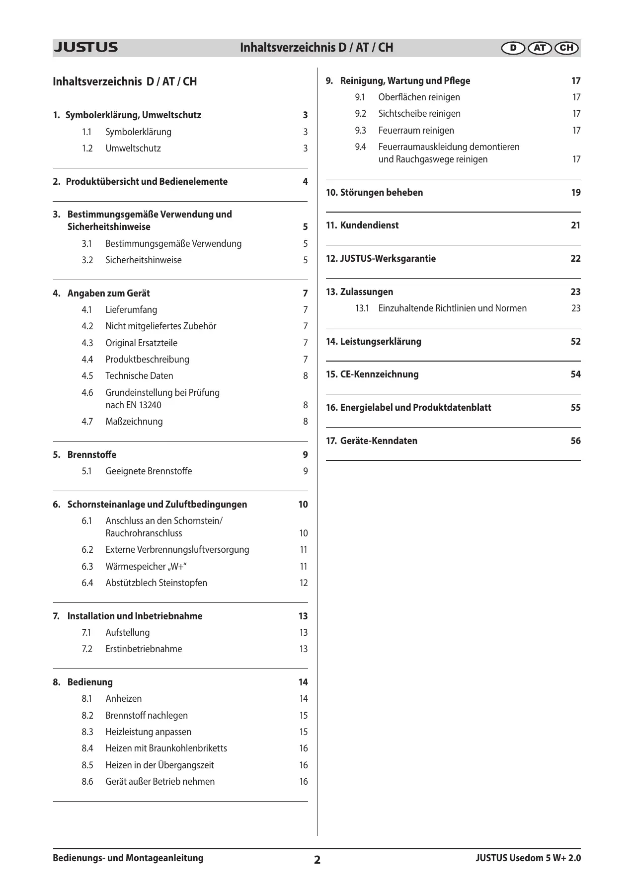 1.2. Protection de l’environnement 25 des canaux de circulation de fumées 39 2. Information produit et éléments de commande 26 | 10. Remédier aux dysfonctionnements a 3. Utilisation conforme à la législation et consignes de 11. Service après-vente 43 sécurité 27 31 Utilisation conforme à la législation 27 | 12. Garantie contractuelle JUSTUS 44 3.2 Consignes de sécurité 27 13. Conformités aux normes 45 4. Description de l'appareil 29 13.1 Normes en vigueur 45 41 Pièces fournies 29 42 Pièces non-fournies 29 | 14. Déclaration de performances 52 4.3 Pièces de rechange d'origine 29 44 Description de l'appareil 29 | 15. Marquage CE 54 8.5 Chauffage à la mi- saison 38 8.6 Mise hors-service de l'appareil 38 Manuel d'installation et d'utilisation 24 JUSTUS Usedom 5 W+ 2.0