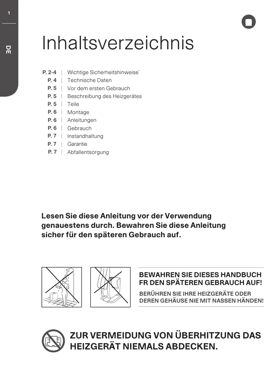 Éviter un potentiel danger d'incendie en s'assurant que l'en- trée d'air n’est bloquée ni recouverte. Le chauffage doit être utilisé dans des pièces avec un sol plat.