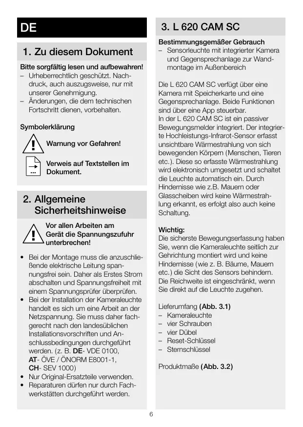 Avant toute intervention sur L'installation de l'applique avec caméra implique une intervention sur le réseau électrique et doit donc être effectuée correctement et conformément à la nomme NF C-15100. (Par ex. DE - VDE 0100, AT - ÔVE / NORM E8001-1, CH - SEV 1000) Utiser uniquement des pièces de: rechange d'origine. Les réparations ne doivent être effec- tuées que par des ateliers spécialisés.