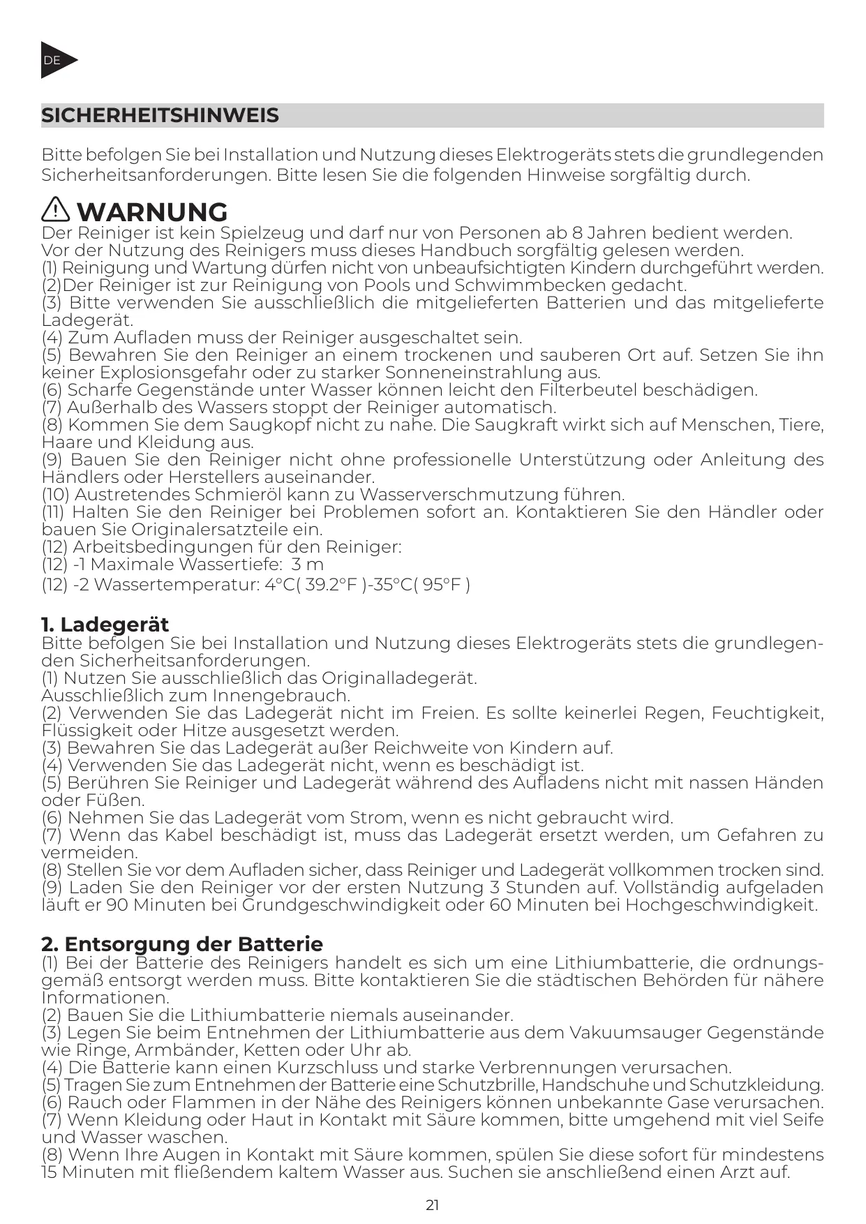 (9) Charger la batterie du nettoyeur 3 heures avant la première utilisation. Lorsque la batterie est complètement chargée, elle peut fonctionner pendant 90 minutes à une vitesse standard et 60 minutes à une vitesse élevée.