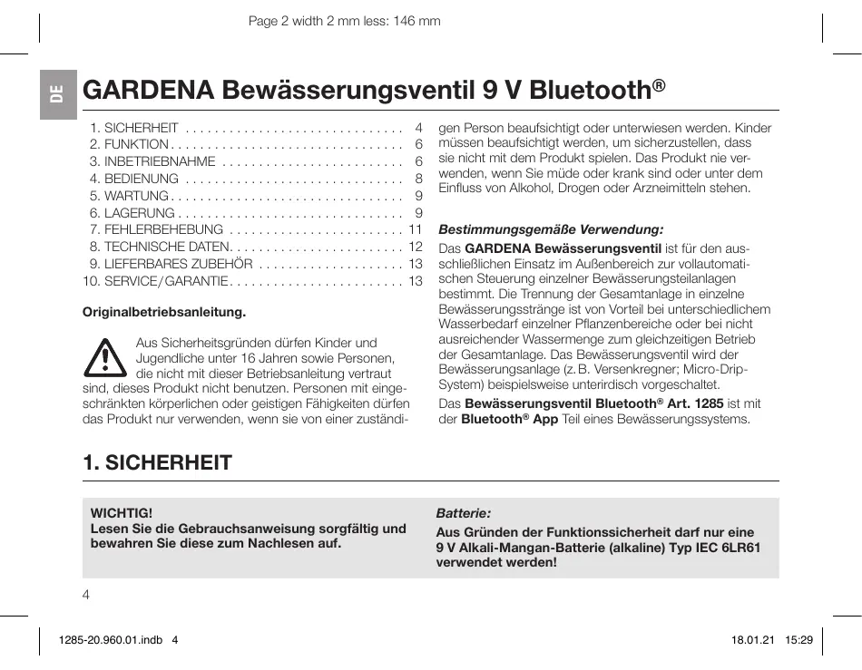 Finden Sie kostenlos die Bedienungsanleitung des Geräts 1285 GARDENA als PDF.