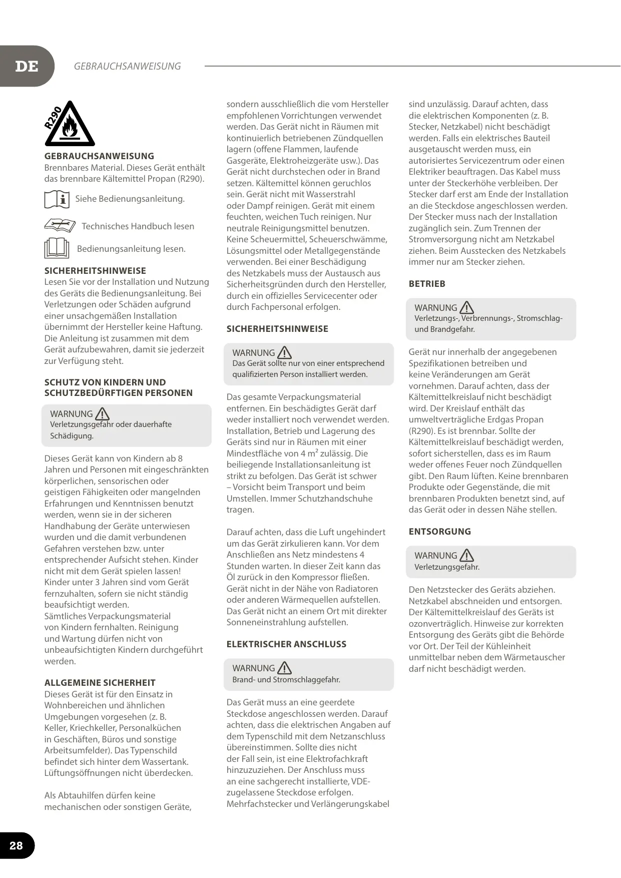 Ne pas utiliser de dispositifs mécaniques ou d'autres moyens pour accélérer le processus de dégivrage, autres que ceux recommandés par le fabricant. L'appareil ne doit pas être entreposé dans une pièce dans laquelle des sources inflammables fonctionnent en permanence (flammes nues, appareil à gaz, radiateur électrique, etc). Ne pas percer ni brûler. Tenir compte du fait que les réfrigérants n'ont pas forcément d'odeur. Ne pas utiliser de pulvérisation d'eau ni de vapeur pour nettoyer l'appareil. Nettoyer l'appareil à l'aide d'un chiffon doux humide. Utiliser uniquement des détergents neutres.