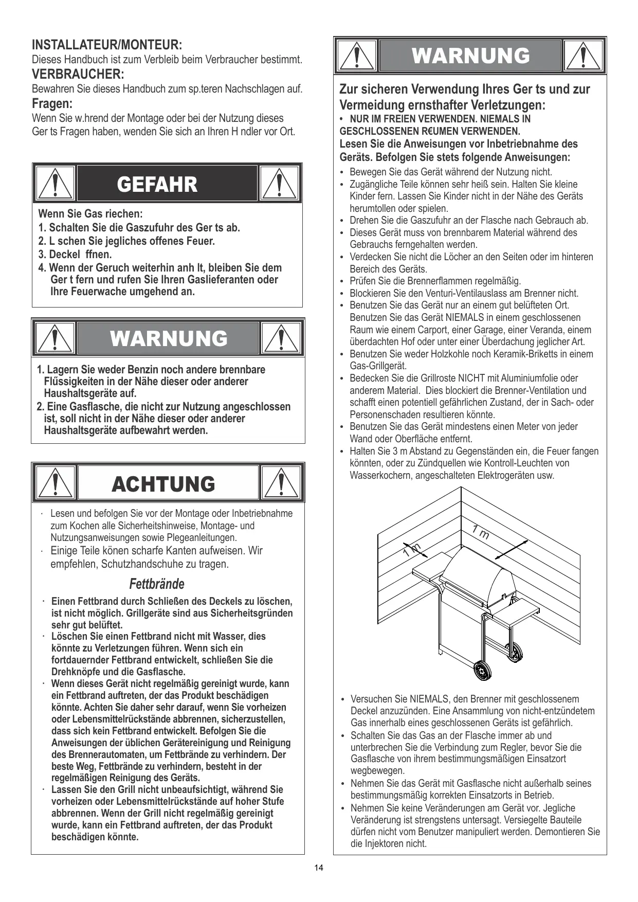 In das Gerät eingesetzte Zylinder dürfen einen maximalen Durchmesser von 340 mm und eine maximale Hôhe einschlieRlich Regler von 580 mm haben. Grôkere Zylinder dürfen nur unter die Seitenablage oder hinter den Grill gestellt werden. Auf den Boden gestellte Zylinder dürfen nicht unter die Heizplatte gestellt werden.