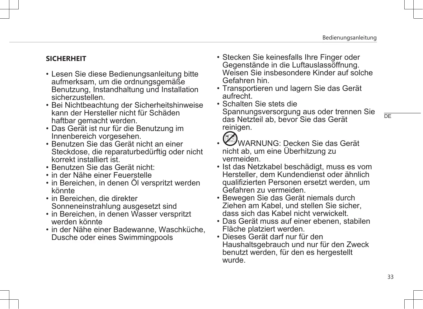 - Afin de vous éviter un choc électrique, n'immergez pas le cordon, la prise ou l'appareil dans de l'eau ou autre liquide.