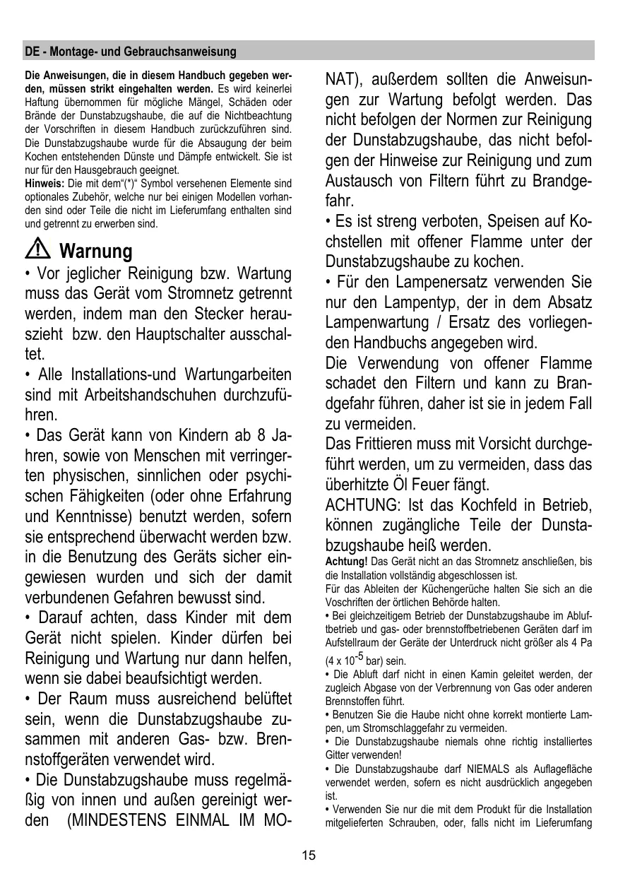 + La hotte ne doit JAMAIS être utilisée comme une surface d'appui, sauf indication expresse.