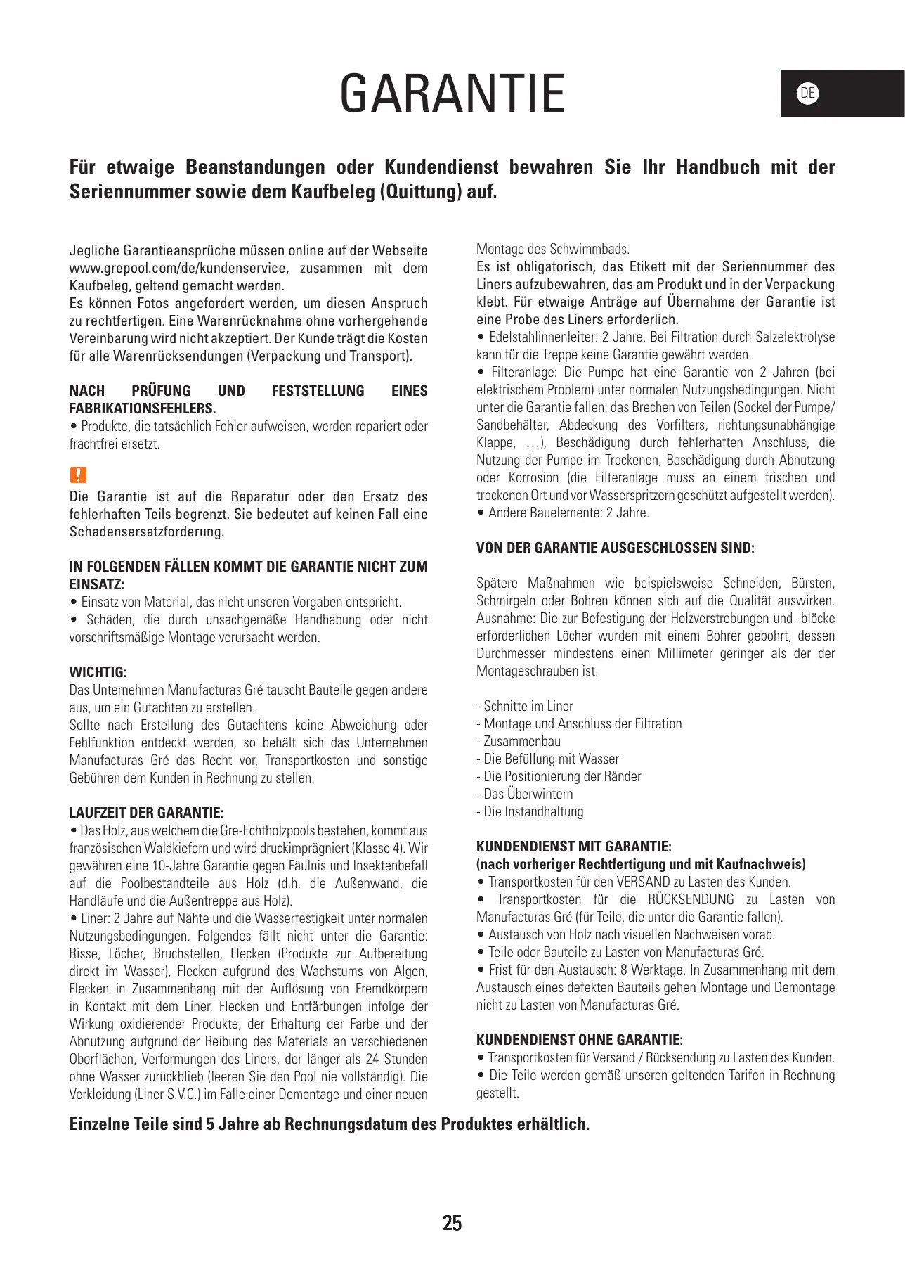 + Le liner : 2 ans sur les soudures et l'étanchéité, dans les conditions d'un usage normal. Ne sont pas garantis : Les accrocs, trous, déchirures, tâches (produits de traitement directement dans l'eau}, tâches liées au développement d'algues, tâches liées à la décomposition de corps étrangers en contact avec le liner, tâches et décolorations résultant de l'action de produits oxydants, tenue de couleur et l'usure due au frottement de la matière sur divers surfaces. Les déformations du liner resté plus de 24h