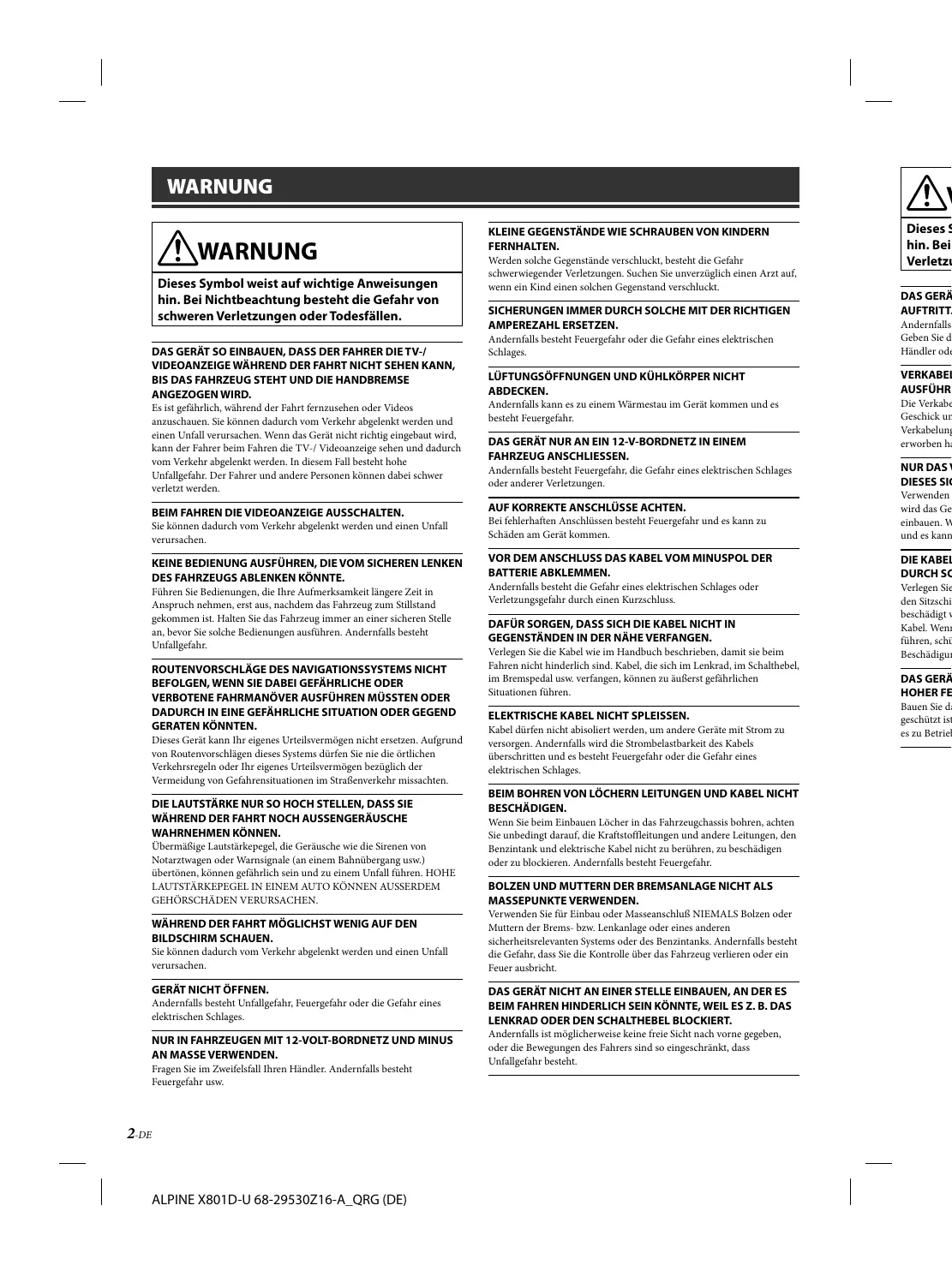 1-DE ALPINE X801D-U 68-29530Z16-A_QRG (DE) WARNUNG WARNUNG Dieses Symbol weist auf wichtige Anweisungen hin. Bei Nichtbeachtung besteht die Gefahr von schweren Verletzungen oder Todesfällen.