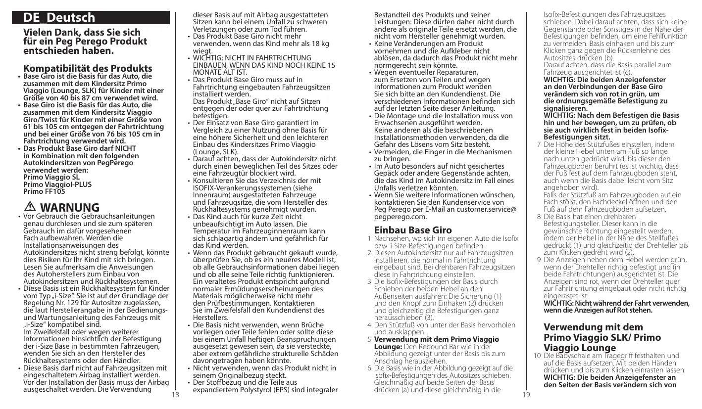 Laden Sie die Anleitung für Ihr Autositz kostenlos im PDF-Format! Finden Sie Ihr Handbuch Base Giro - PEG PEREGO und nehmen Sie Ihr elektronisches Gerät wieder in die Hand. Auf dieser Seite sind alle Dokumente veröffentlicht, die für die Verwendung Ihres Geräts notwendig sind. Base Giro von der Marke PEG PEREGO.