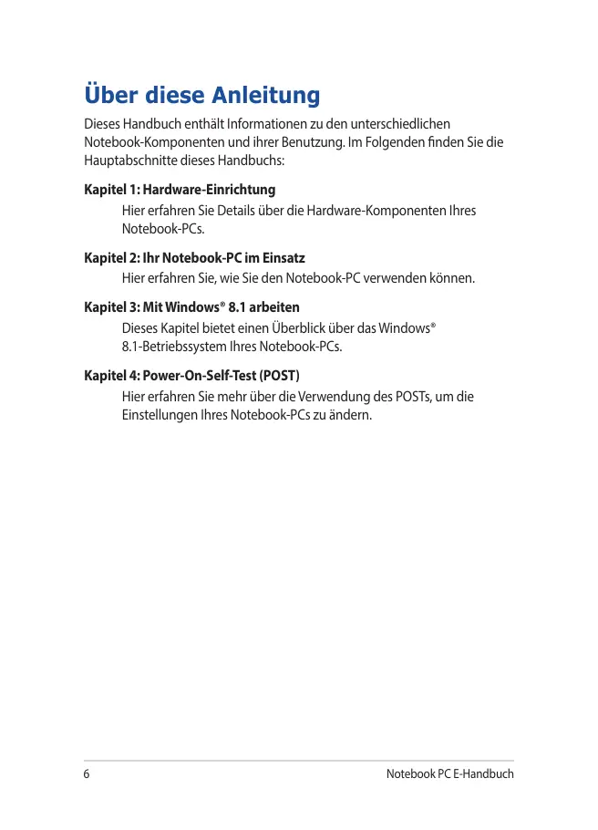 Über diese Anleitung Dieses Handbuch enthält Informationen zu den unterschiedlichen Notebook-Komponenten und ihrer Benutzung. Im Folgenden finden Sie die Hauptabschnitte dieses Handbuchs: Kapitel 1: Hardware-Einrichtung Hier erfahren Sie Details über die Hardware-Komponenten Ihres Notebook-PCs. Kapitel 2: Ihr Notebook-PC im Einsatz Hier erfahren Sie, wie Sie den Notebook-PC verwenden können. Kapitel 3: Mit Windows® 8.1 arbeiten Dieses Kapitel bietet einen Überblick über das Windows® 8.1-Betriebssystem Ihres Notebook-PCs. Kapitel 4: Power-On-Self-Test (POST) Hier erfahren Sie mehr über die Verwendung des POSTs, um die Einstellungen Ihres Notebook-PCs zu ändern.