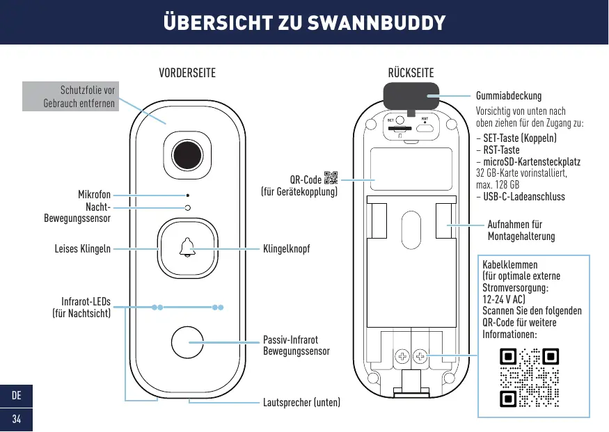 max. 128 6B Mikrofon {für Gerätekopplung) — USB-C-Ladeanschluss Nacht- Bewegungssensor Aufnähmen für TAN Montagehalterung Leises Klingeln a Klingelknopt (TJ Kabelklemmen {für optimale externe Stromversorgung 12-24 V AC)