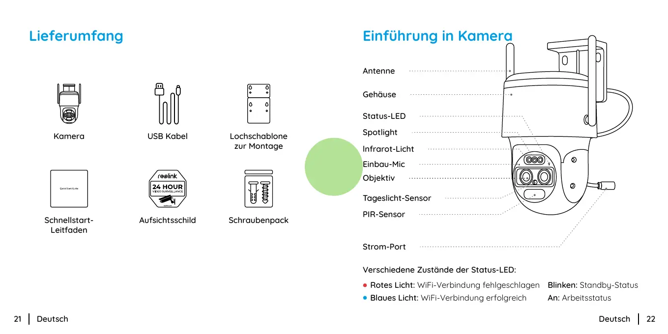 + Rotes Licht: WiFi-Verbindung fehigeschlagen Blinken: Standby-Status + Blaues Licht: WiFi-Verbindung erfolgreich An: Arbeitsstatus