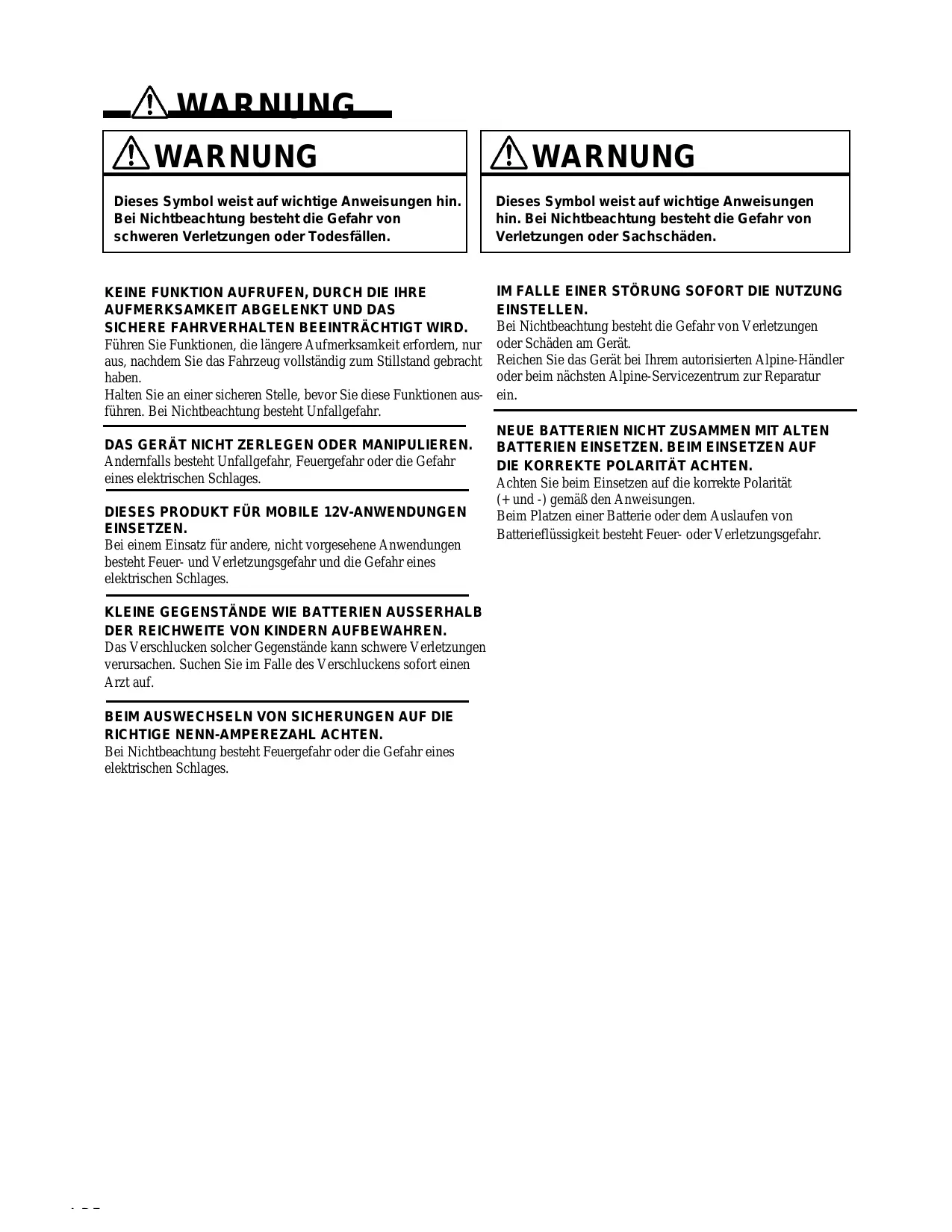 RICHTIGE NENN-AMPEREZAHL ACHTEN. Bei Nichtbeachtung besteht Feuergefahr oder die Gefahr eines elektrischen Schlages. 4-DE WARNUNG Dieses Symbol weist auf wichtige Anweisungen hin. Bei Nichtbeachtung besteht die Gefahr von Verletzungen oder Sachschäden. IM FALLE EINER STÖRUNG SOFORT DIE NUTZUNG EINSTELLEN. Bei Nichtbeachtung besteht die Gefahr von Verletzungen oder Schäden am Gerät. Reichen Sie das Gerät bei Ihrem autorisierten Alpine-Händler oder beim nächsten Alpine-Servicezentrum zur Reparatur ein.