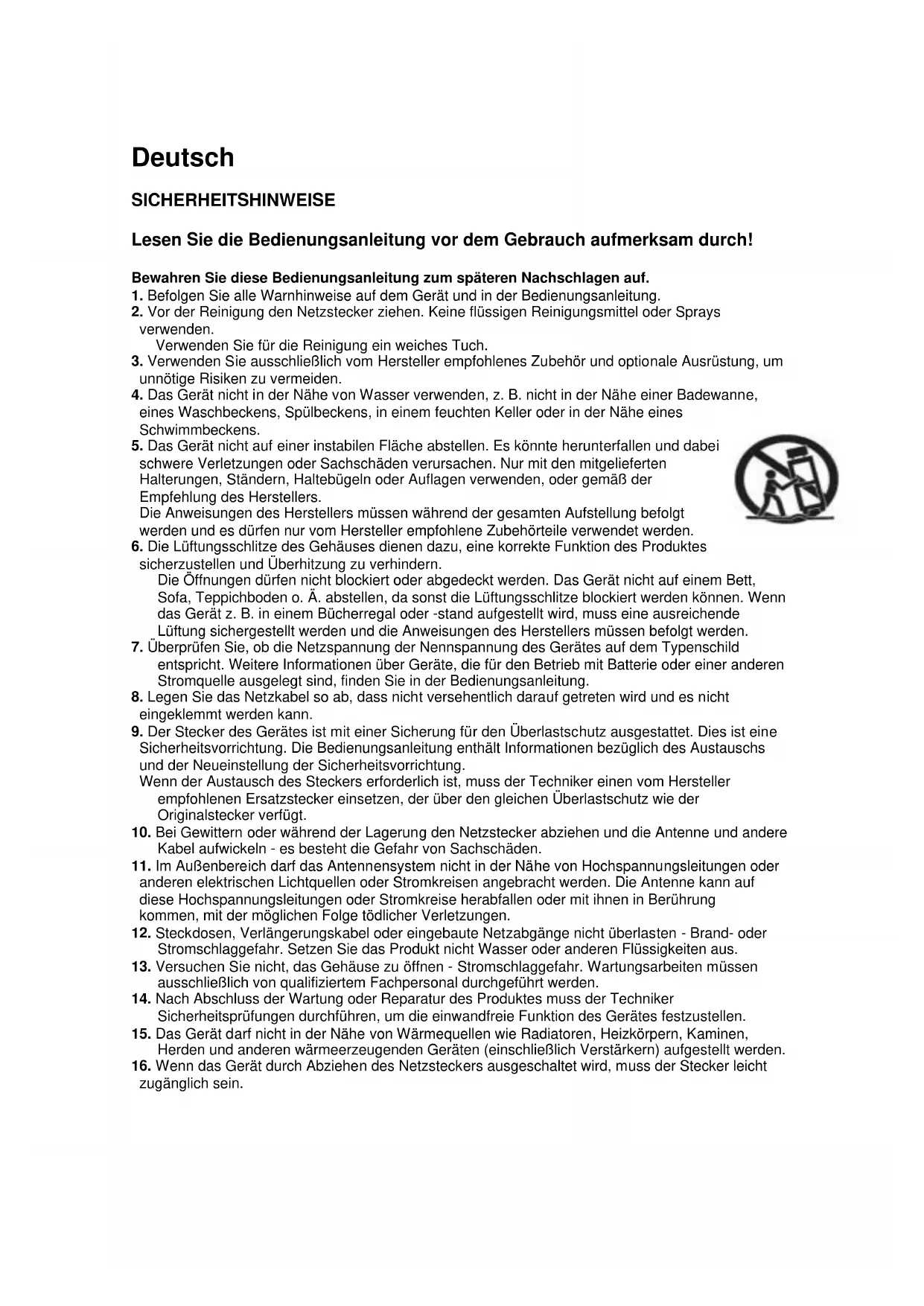 - Das Gerät nicht auf einer instabilen Fläche abstellen. Es könnte herunterfallen und damit schwere Verletzungen oder Sachschäden verursachen. Nur mit den mitgelieferten Halterungen, Ständern, Haltebügeln oder Auflagen verwenden, oder gemäß der Empfehlung des Herstellers.