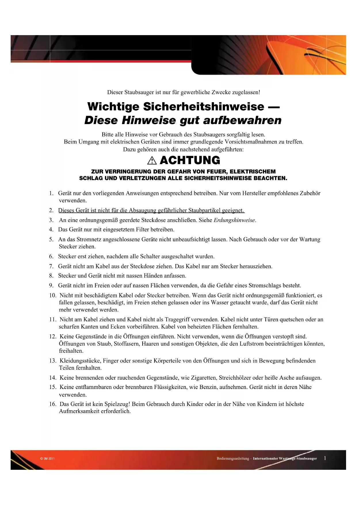 Bedienungsanleitung – Internationaler Wartungs-Staubsauger © 3M 2011 Dieser Staubsauger ist nur für gewerbliche Zwecke zugelassen!
