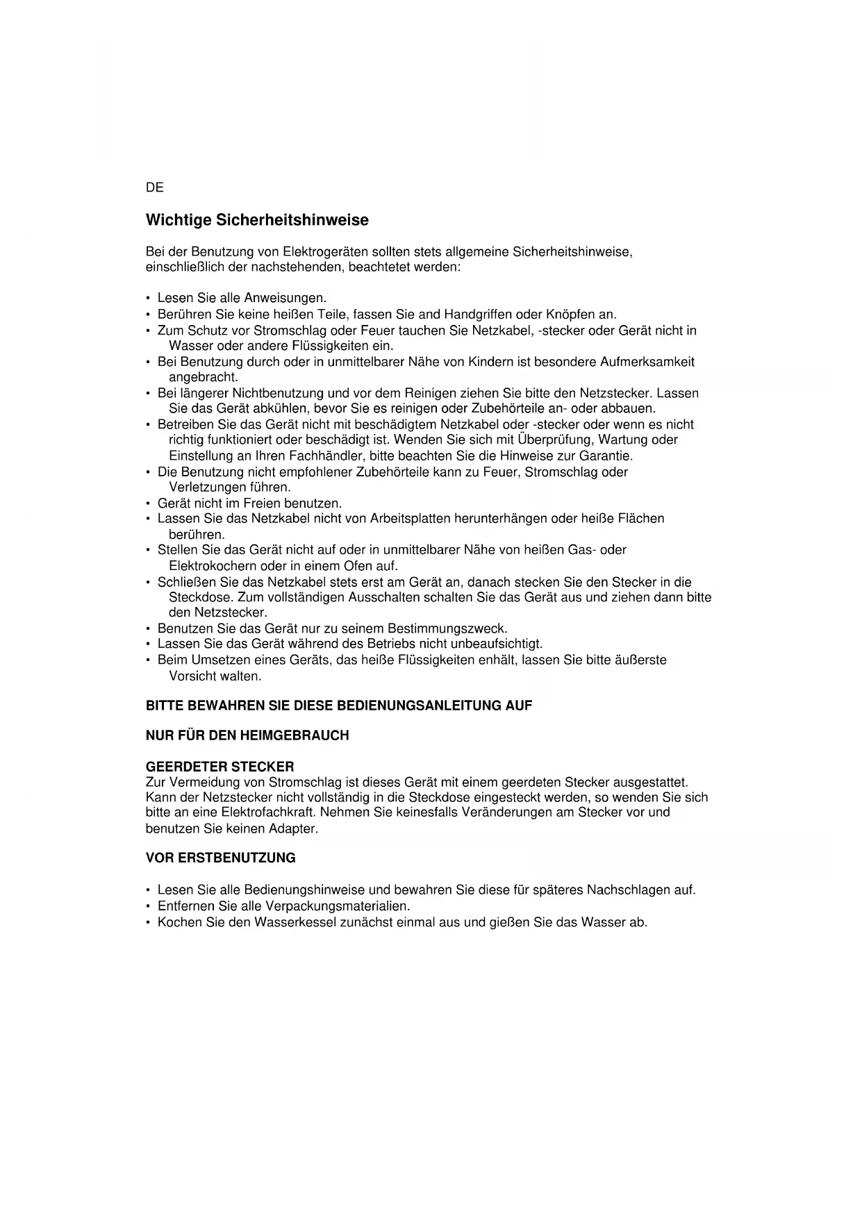 Benutzen Sie den Wasserkessel nur zum Kochen von Wasser, andere Flüssigkeiten