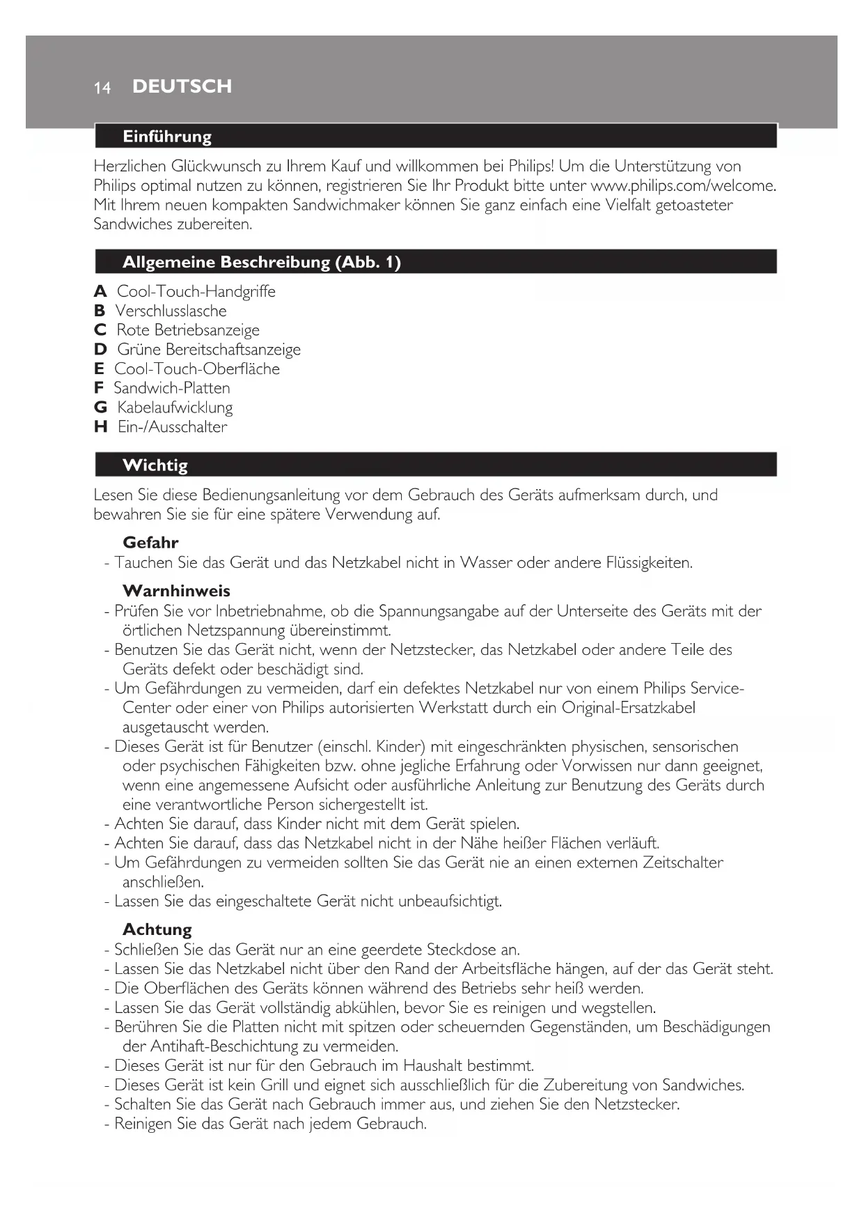 Herzlichen Glückwunsch zu Ihrem Kauf und willkommen bei Philips! Um die Unterstützung von Philips optimal nutzen zu können, registrieren Sie Ihr Produkt bitte unter www.philips.com/welcome. Mit Ihrem neuen kompakten Sandwichmaker können Sie ganz einfach eine Vielfalt getoasteter Sandwiches zubereiten.