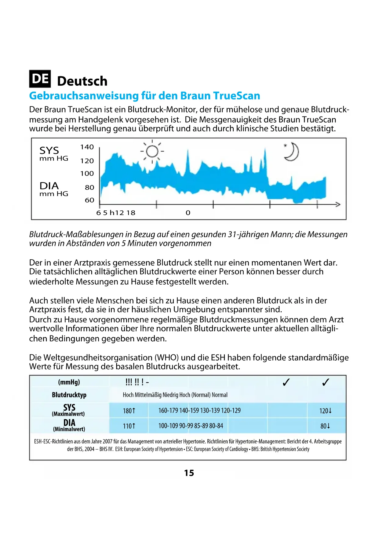 This product conforms to the provisions of the EC directive 93 /42 / EEC (Medical Device Directive). MEDICAL ELECTRICAL EQUIPMENT needs special precautions regarding EMC. For detailed Description of EMC requirements please contact an authorized local Service Centre (see guarantee card). TUV Safety tests validated Guarantee See warranty statement inside the Kaz Customer Service Centre booklet.15 Gebrauchsanweisung für den Braun TrueScan Der Braun TrueScan ist ein Blutdruck-Monitor, der für mühelose und genaue Blutdruck-messung am Handgelenk vorgesehen ist. Die Messgenauigkeit des Braun TrueScan wurde bei Herstellung genau überprüft und auch durch klinische Studien bestätigt. Blutdruck-Maßablesungen in Bezug auf einen gesunden 31-jährigen Mann; die Messungen wurden in Abständen von 5 Minuten vorgenommenDer in einer Arztpraxis gemessene Blutdruck stellt nur einen momentanen Wert dar. Die tatsächlichen alltäglichen Blutdruckwerte einer Person können besser durch wiederholte Messungen zu Hause festgestellt werden.Auch stellen viele Menschen bei sich zu Hause einen anderen Blutdruck als in der Arztpraxis fest, da sie in der häuslichen Umgebung entspannter sind. Durch zu Hause vorgenommene regelmäßige Blutdruckmessungen können dem Arzt wertvolle Informationen über Ihre normalen Blutdruckwerte unter aktuellen alltägli-chen Bedingungen gegeben werden. Die Weltgesundheitsorganisation (WHO) und die ESH haben folgende standardmäßige Werte für Messung des basalen Blutdrucks ausgearbeitet. (mmHg)