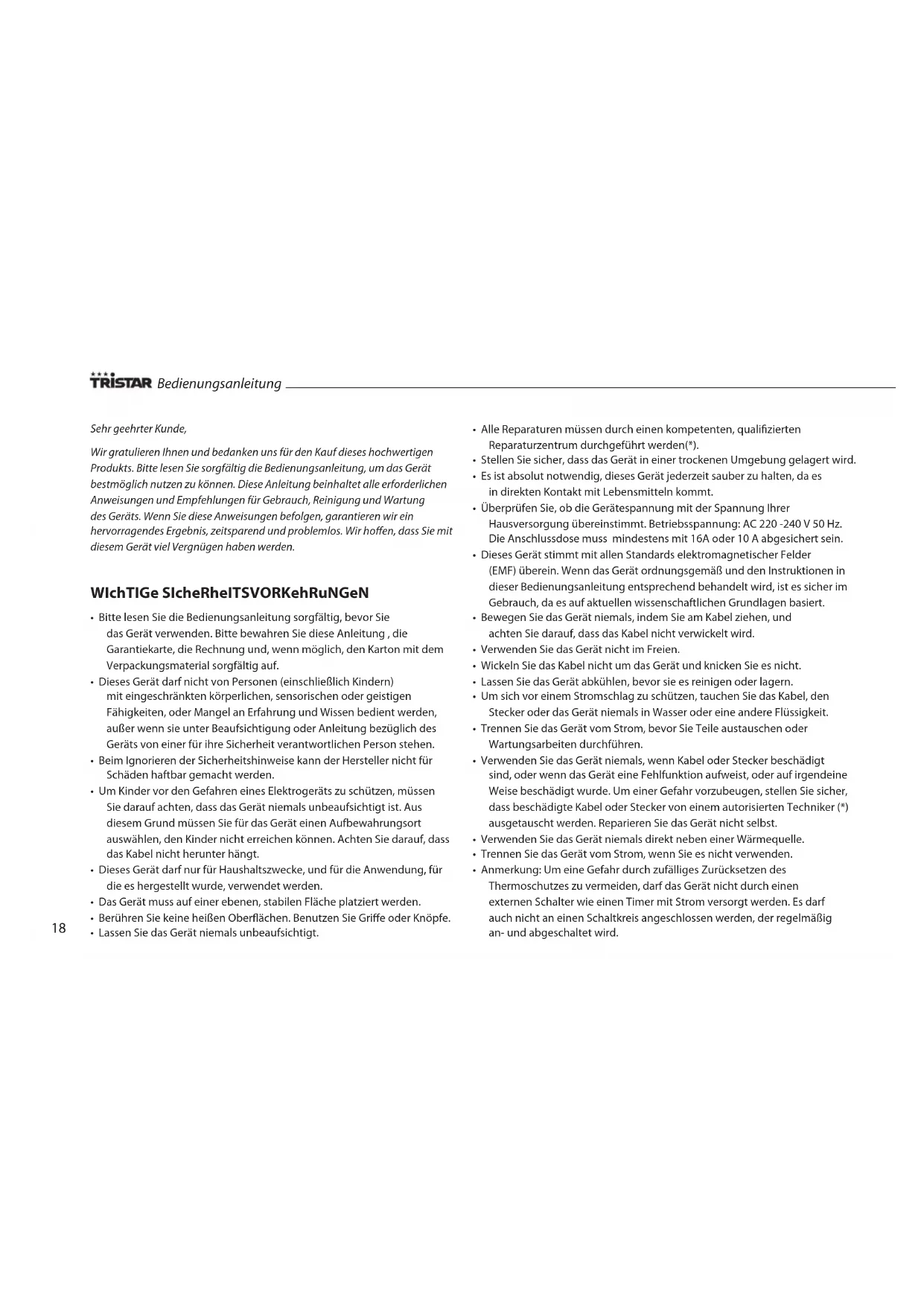 • Tristar ist nicht verantwortlich für Beschädigungen, die auftreten