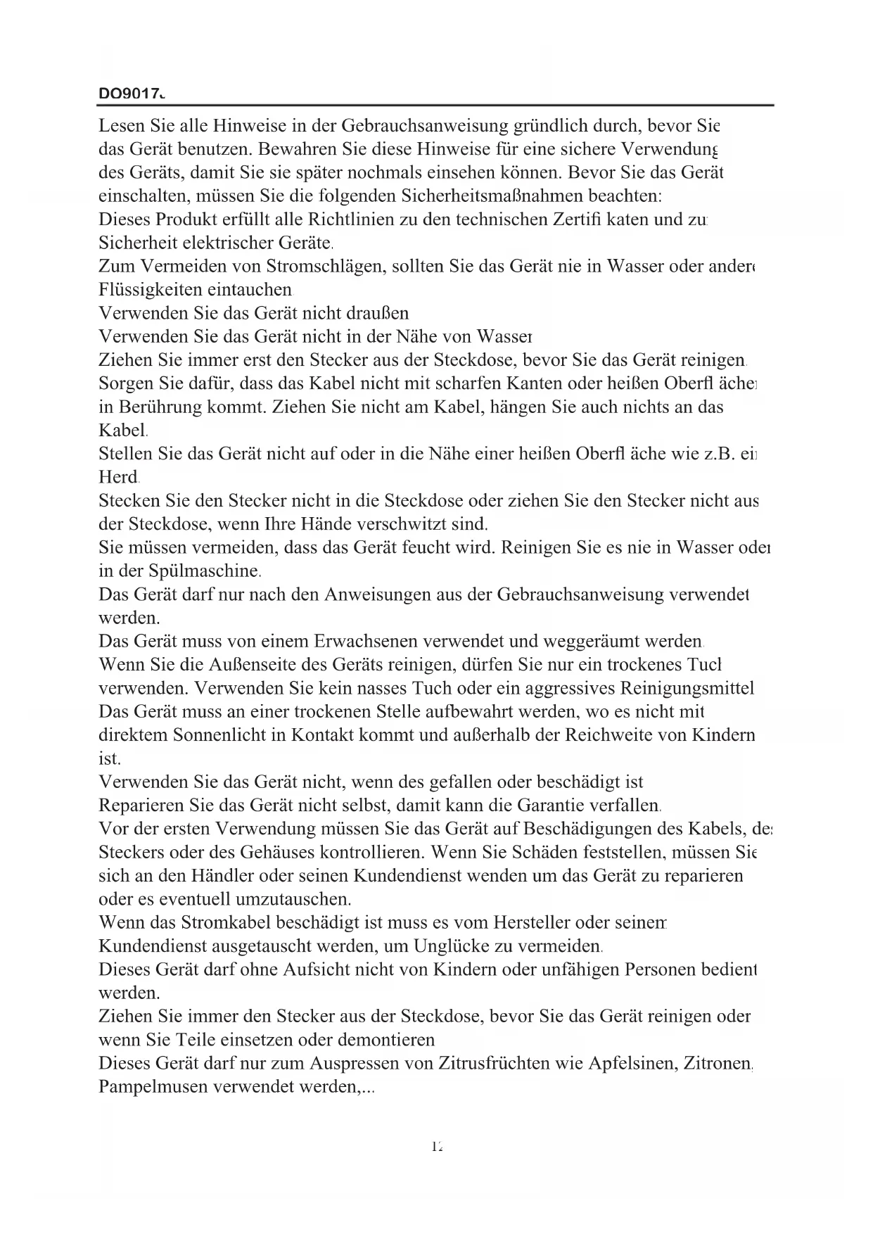 11DO9017J Lesen Sie alle Hinweise in der Gebrauchsanweisung gründlich durch, bevor Sie das Gerät benutzen. Bewahren Sie diese Hinweise für eine sichere Verwendung des Geräts, damit Sie sie später nochmals einsehen können. Bevor Sie das Gerät einschalten, müssen Sie die folgenden Sicherheitsmaßnahmen beachten: Dieses Produkt erfüllt alle Richtlinien zu den technischen Zertifi katen und zur Sicherheit elektrischer Geräte. Zum Vermeiden von Stromschlägen, sollten Sie das Gerät nie in Wasser oder andere Flüssigkeiten eintauchen. Verwenden Sie das Gerät nicht draußen. Verwenden Sie das Gerät nicht in der Nähe von Wasser. Ziehen Sie immer erst den Stecker aus der Steckdose, bevor Sie das Gerät reinigen. Sorgen Sie dafür, dass das Kabel nicht mit scharfen Kanten oder heißen Oberfl ächen in Berührung kommt. Ziehen Sie nicht am Kabel, hängen Sie auch nichts an das Kabel. Stellen Sie das Gerät nicht auf oder in die Nähe einer heißen Oberfl äche wie z.B. ein Herd. Stecken Sie den Stecker nicht in die Steckdose oder ziehen Sie den Stecker nicht aus der Steckdose, wenn Ihre Hände verschwitzt sind. Sie müssen vermeiden, dass das Gerät feucht wird. Reinigen Sie es nie in Wasser oder in der Spülmaschine. Das Gerät darf nur nach den Anweisungen aus der Gebrauchsanweisung verwendet werden. Das Gerät muss von einem Erwachsenen verwendet und weggeräumt werden. Wenn Sie die Außenseite des Geräts reinigen, dürfen Sie nur ein trockenes Tuch verwenden. Verwenden Sie kein nasses Tuch oder ein aggressives Reinigungsmittel. Das Gerät muss an einer trockenen Stelle aufbewahrt werden, wo es nicht mit direktem Sonnenlicht in Kontakt kommt und außerhalb der Reichweite von Kindern ist. Verwenden Sie das Gerät nicht, wenn des gefallen oder beschädigt ist. Reparieren Sie das Gerät nicht selbst, damit kann die Garantie verfallen. Vor der ersten Verwendung müssen Sie das Gerät auf Beschädigungen des Kabels, des Steckers oder des Gehäuses kontrollieren. Wenn Sie Schäden feststellen, müssen Sie sich an den Händler oder seinen Kundendienst wenden um das Gerät zu reparieren oder es eventuell umzutauschen. Wenn das Stromkabel beschädigt ist muss es vom Hersteller oder seinem Kundendienst ausgetauscht werden, um Unglücke zu vermeiden. Dieses Gerät darf ohne Aufsicht nicht von Kindern oder unfähigen Personen bedient werden. Ziehen Sie immer den Stecker aus der Steckdose, bevor Sie das Gerät reinigen oder wenn Sie Teile einsetzen oder demontieren. Dieses Gerät darf nur zum Auspressen von Zitrusfrüchten wie Apfelsinen, Zitronen, Pampelmusen verwendet werden,... 12DO9017J TEILE