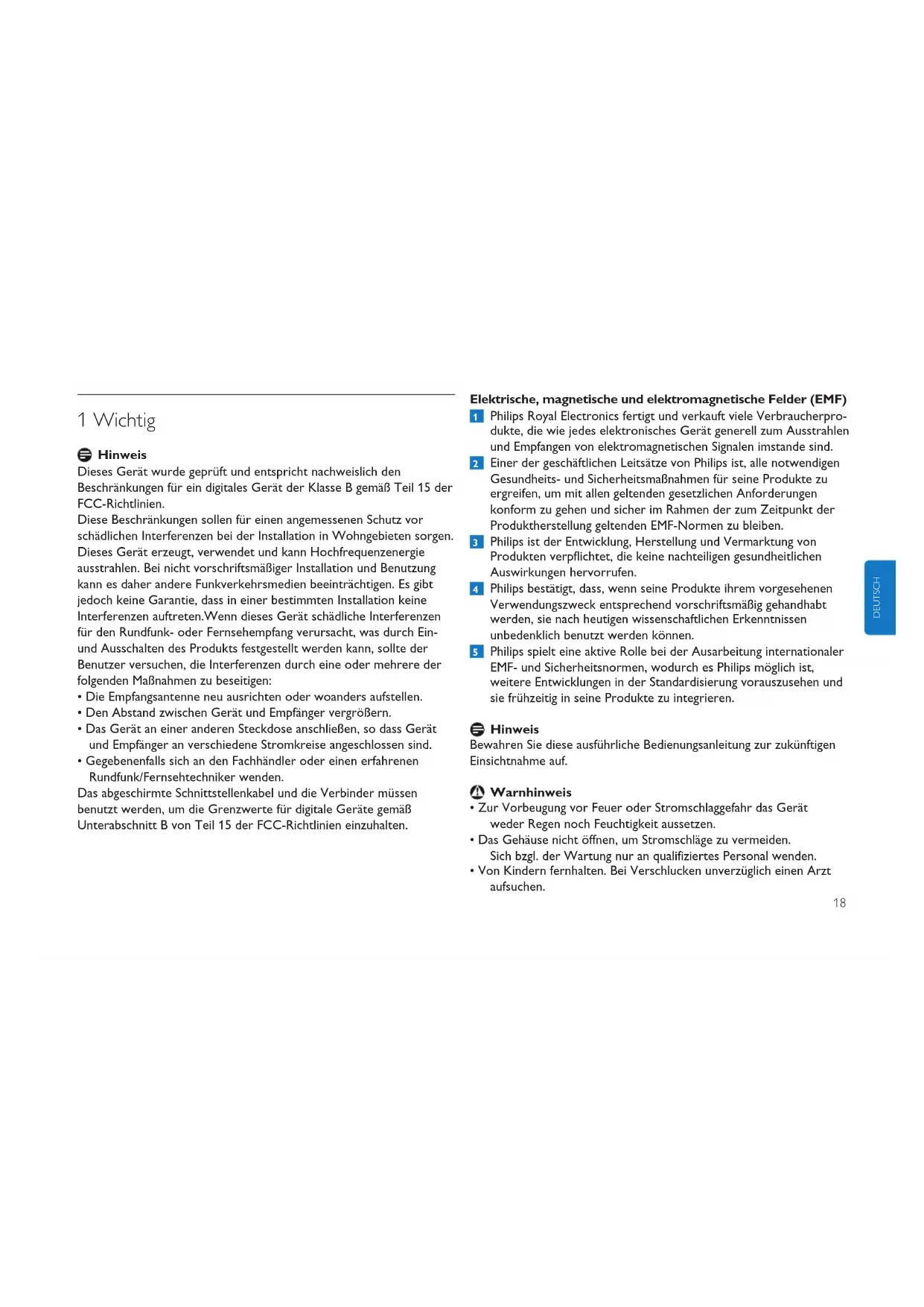 - Gegebenenfalls sich an den Fachhändler oder einen erfahrenen Rundfunk/Fernsehtechniker wenden. Das abgeschirmte Schnittstellenkabel und die Verbinder müssen benutzt werden, um die Grenzwerte für digitale Geräte gemäß Unterabschnitt B von Teil 15 der FCC-Richtlinien einzuhalten. Elektrische, magnetische und elektromagnetische Felder (EMF) Philips Royal Electronics fertigt und verkauft viele Verbraucherpro- dukte, die wie jedes elektronisches Gerät generell zum Ausstrahlen und Empfangen von elektromagnetischen Signalen imstande sind. Einer der geschäftlichen Leitsätze von Philips ist, alle notwendigen Gesundheits- und Sicherheitsmaßnahmen für seine Produkte zu ergreifen, um mit allen geltenden gesetzlichen Anforderungen konform zu gehen und sicher im Rahmen der zum Zeitpunkt der Produktherstellung geltenden EMF-Normen zu bleiben. Philips ist der Entwicklung, Herstellung und Vermarktung von Produkten verpflichtet, die keine nachteiligen gesundheitlichen Auswirkungen hervorrufen. Philips bestätigt, dass, wenn seine Produkte ihrem vorgesehenen Verwendungszweck entsprechend vorschriftsmäßig gehandhabt werden, sie nach heutigen wissenschaftlichen Erkenntnissen unbedenklich benutzt werden können. Philips spielt eine aktive Rolle bei der Ausarbeitung internationaler EMF- und Sicherheitsnormen, wodurch es Philips möglich ist, weitere Entwicklungen in der Standardisierung vorauszusehen und sie frühzeitig in seine Produkte zu integrieren. Hinweis Bewahren Sie diese ausführliche Bedienungsanleitung zur zukünftigen Einsichtnahme auf. Warnhinweis