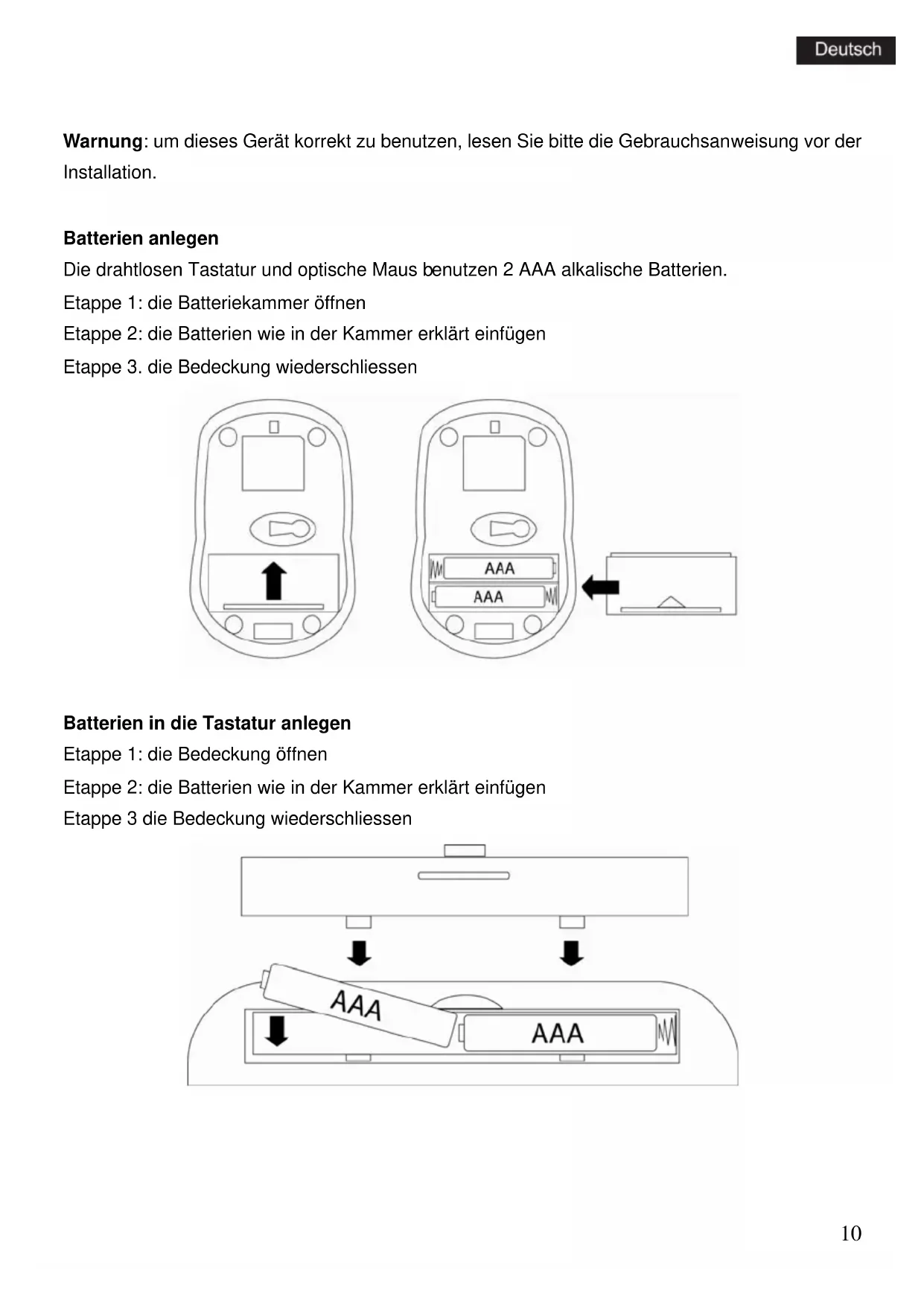 9Warnung: um dieses Gerät korrekt zu benutzen, lesen Sie bitte die Gebrauchsanweisung vor der enutzen 2 AAA alkalische Batterien. Etappe 1: die Batteriekammer öffnen Etappe 2: die Batterien wie in der Kammer erklärt einfügen Etappe 3. die Bedeckung wiederschliessen Installation. Batterien anlegen Die drahtlosen Tastatur und optische Maus b