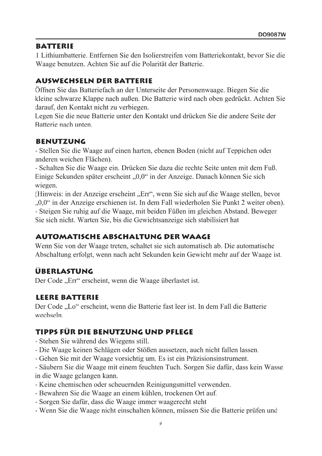 - Die Waage nicht zu geschäftlichen Zwecken benutzen.DO9087W BATTERY