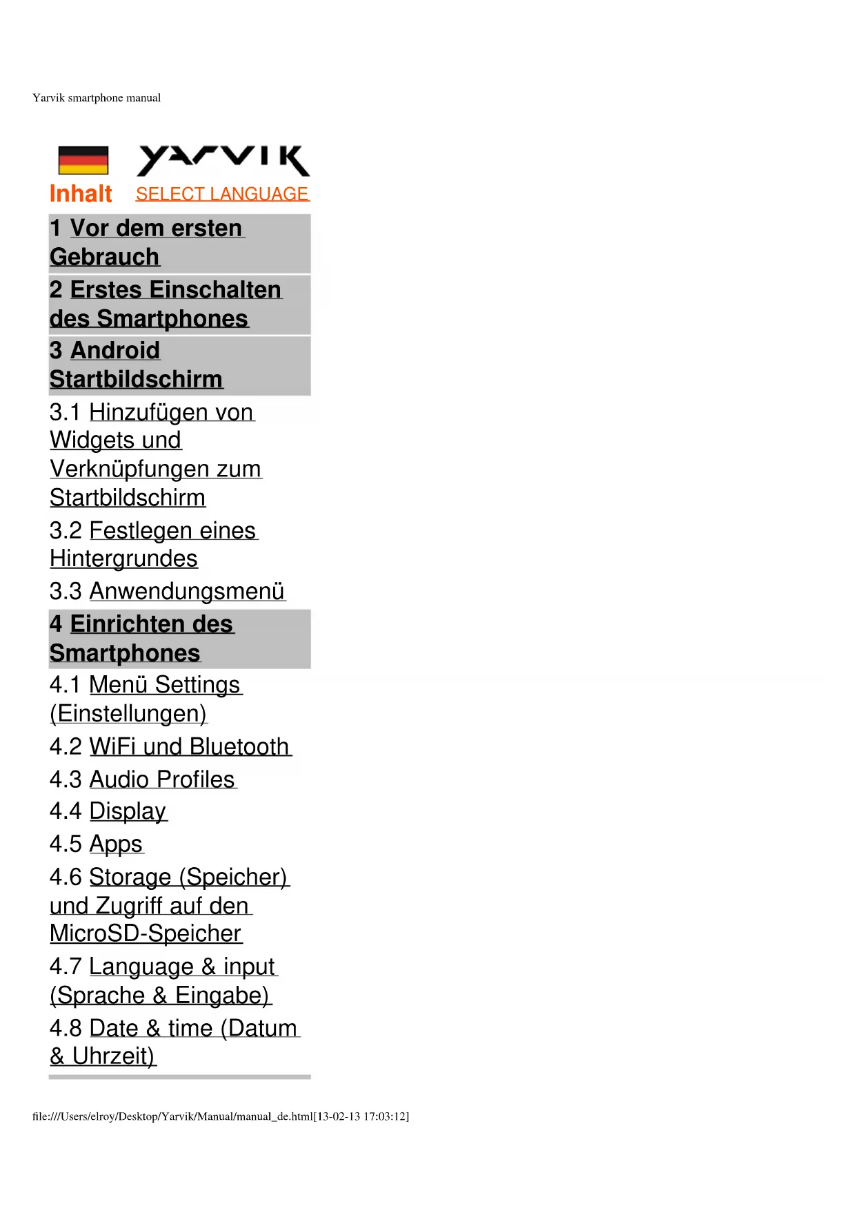 - Setzen Sie das SmartphoneYarvik smartphone manual file:///Users/elroy/Desktop/Yarvik/Manual/manual_de.html[13-02-13 17:03:12] nicht für einen längeren Zeitraum starker Sonneneinstrahlung aus.