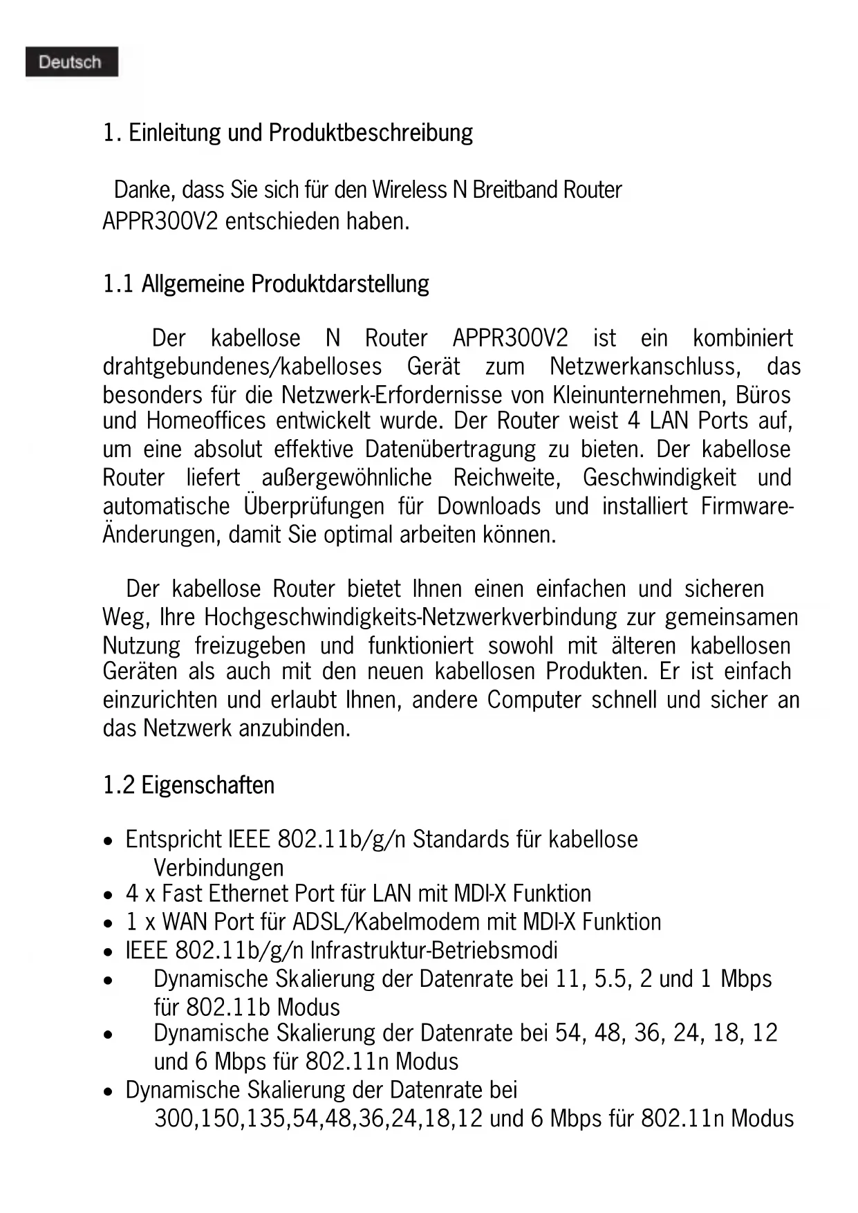 Entspricht IEEE 802.11b/g/n Standards für kabellose Verbindungen 4 x Fast Ethernet Port für LAN mit MDI-X Funktion 1 x WAN Port für ADSL/Kabelmodem mit MDI-X Funktion IEEE 802.11b/g/n Infrastruktur-Betriebsmodi Dynamische Skalierung der Datenrate bei 11, 5.5, 2 und 1 Mbps für 802.11b Modus Dynamische Skalierung der Datenrate bei 54, 48, 36, 24, 18, 12 und 6 Mbps für 802.11n Modus Dynamische Skalierung der Datenrate bei 300,150,135,54,48,36,24,18,12 und 6 Mbps für 802.11n Modus Erlaubt automatische Umschaltung der Datenrate für absolute Zuverlässigkeit, optimierten Datendurchsatz und Sendebereich Unterstützt kabellose Datenverschlüsselung mit 64/128-bit WEP Standard zur Sicherheit Unterstützt erhöhte Sicherheit für WPA-PSK, WPA2-PSK, WPA und WPA2 Webbasierte Konfigurationstools und Management über WEB Browser Unterstützt PPPoE/PPTP/L2TP Protokoll für ADSL Unterstützt NAT IP-Adresse zur Mitbenutzung für alle LAN-Benutzer Unterstützt DHCP Server/Client Unterstützt Firewall-Schutz, Virtual Server Mapping, spezielle Anwendungseinstellung Unterstützt UPnP Unterstützt statistische Informationen