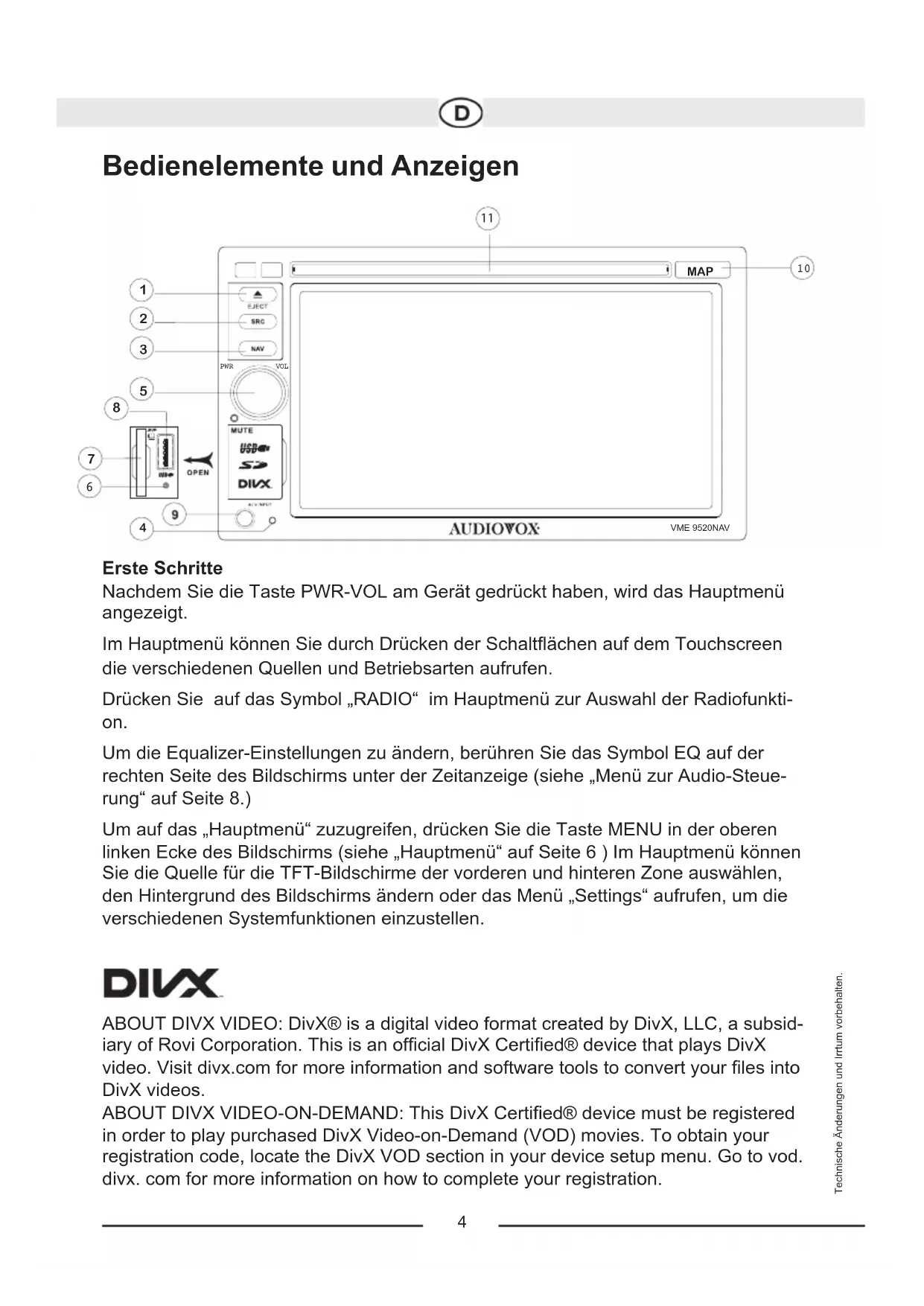 Bedienelemente und Anzeigen Erste Schritte Nachdem Sie die Taste PWR-VOL am Gerät gedrückt haben, wird das Hauptmenü angezeigt. Im Hauptmenü können Sie durch Drücken der Schaltächen auf dem Touchscreen die verschiedenen Quellen und Betriebsarten aufrufen. Drücken Sie auf das Symbol „RADIO“ im Hauptmenü zur Auswahl der Radiofunkti- on. Um die Equalizer-Einstellungen zu ändern, berühren Sie das Symbol EQ auf der rechten Seite des Bildschirms unter der Zeitanzeige (siehe „Menü zur Audio-Steue- rung“ auf Seite 8.) Um auf das „Hauptmenü“ zuzugreifen, drücken Sie die Taste MENU in der oberen linken Ecke des Bildschirms (siehe „Hauptmenü“ auf Seite 6 ) Im Hauptmenü können Sie die Quelle für die TFT-Bildschirme der vorderen und hinteren Zone auswählen, den Hintergrund des Bildschirms ändern oder das Menü „Settings“ aufrufen, um die verschiedenen Systemfunktionen einzustellen. ABOUT DIVX VIDEO: DivX® is a digital video format created by DivX, LLC, a subsid- iary of Rovi Corporation. This is an ofcial DivX Certied® device that plays DivX video. Visit divx.com for more information and software tools to convert your les into DivX videos. ABOUT DIVX VIDEO-ON-DEMAND: This DivX Certied® device must be registered in order to play purchased DivX Video-on-Demand (VOD) movies. To obtain your registration code, locate the DivX VOD section in your device setup menu. Go to vod. divx. com for more information on how to complete your registration. MAP