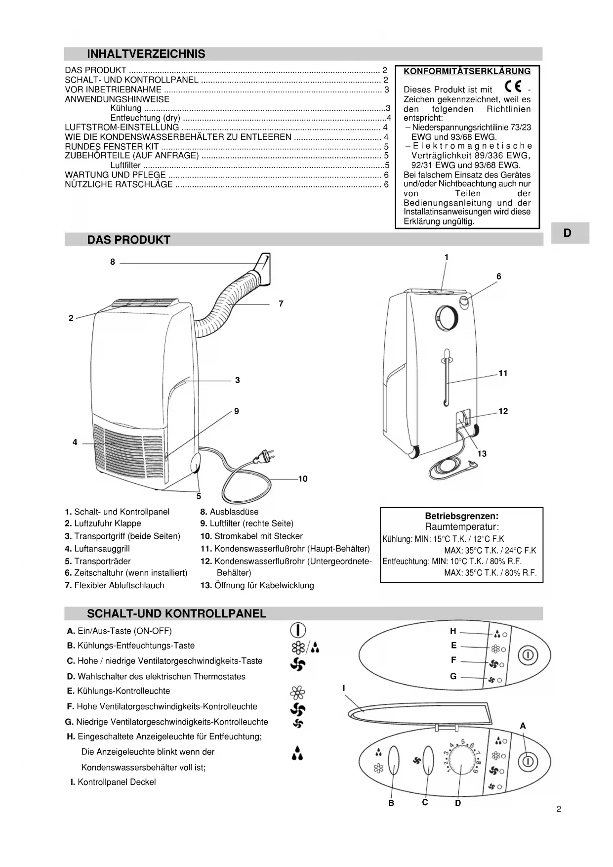 Das Klimagerät kann als Entfeuchter benutzt werden, nur wenn die Raumtemperatur Higher als 10^ ist. Wenn die Temperatur unter 10 ^ C ist, schaltet sich der Kompressor aus und die Entfeuchtungsbetrieb nicht aktiviert ist, während der Ventilator weiterarbeititet.
