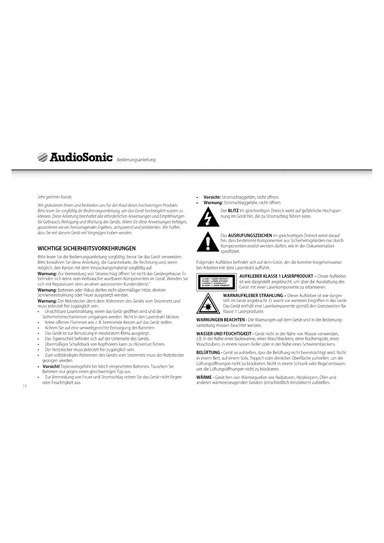 - Warnung: Stromschlaggefahr, nicht öffnen. Der BLITZ im gleichseitigen Dreieck weist auf gefährliche Hochspan- nung im Gerät hin, die zu Stromschlag führen kann. Das AUSRUFUNGSZEICHEN im gleichseitigen Dreieck weist darauf hin, dass bestimmte Komponenten aus Sicherheitsgründen nur durch Komponenten ersetzt werden dürfen, wie in der Dokumentation spezifiziert. Folgender Aufkleber befindet sich auf dem Gerät, der die korrekte Vorgehensweise bei Arbeiten mit dem Laserstrahl aufführt: AUFKLEBER KLASSE 1 LASERPRODUKT – Dieser Aufkleber ist wie dargestellt angebracht, um über die Ausstattung des Gerät mit einer Laserkomponente zu informieren. WARNAUFKLEBER STRAHLUNG – Dieser Aufkleber ist wie darges- tellt im Gerät angebracht. Er warnt vor weiteren Eingriffen in das Gerät. Das Gerät enthält eine Laserkomponente gemäß den Grenzwerten für Klasse 1 Laserprodukte. WARNUNGEN BEACHTEN - Die Warnungen auf dem Gerät und in der Bedienung- sanleitung müssen beachtet werden. WASSER UND FEUCHTIGKEIT - Gerät nicht in der Nähe von Wasser verwenden, z.B. in der Nähe einer Badewanne, eines Waschbeckens, einer Küchenspüle, eines Waschzubers, in einem nassen Keller oder in der Nähe eines Schwimmbeckens. BELÜFTUNG - Gerät so aufstellen, dass die Belüftung nicht beeinträchtigt wird. Nicht in einem Bett, auf einem Sofa, Teppich oder ähnlicher Oberfläche aufstellen, um die Lüftungsöffnungen nicht zu blockieren. Nicht in einem Schrank oder Regal einbauen, um die Lüftungsöffnungen nicht zu blockieren. WÄRME - Gerät fern von Wärmequellen wie Radiatoren, Heizkörpern, Öfen und anderen wärmeerzeugenden Geräten (einschließlich Verstärkern) aufstellen. Bedienungsanleitung1 2