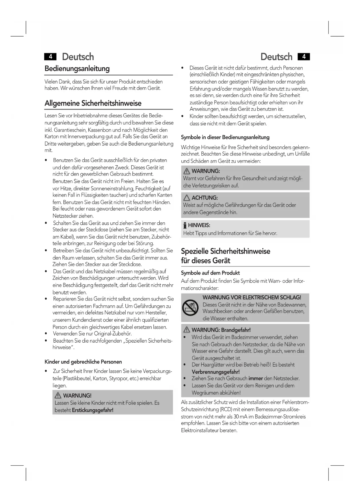 - Kindersolltenbeaufsichtigtwerden,umsicherzustellen, dass sie nicht mit dem Gerät spielen. Symbole in dieser Bedienungsanleitung Wichtige Hinweise für Ihre Sicherheit sind besonders gekenn- zeichnet. Beachten Sie diese Hinweise unbedingt, um Unfälle und Schäden am Gerät zu vermeiden: WARNUNG: Warnt vor Gefahren für Ihre Gesundheit und zeigt mögli- che Verletzungsrisiken auf. ACHTUNG: Weist auf mögliche Gefährdungen für das Gerät oder andere Gegenstände hin. HINWEIS: Hebt Tipps und Informationen für Sie hervor. Spezielle Sicherheitshinweise für dieses Gerät Symbole auf dem Produkt Auf dem Produkt finden Sie Symbole mit Warn- oder Infor- mationscharakter: WARNUNG VOR ELEKTRISCHEM SCHLAG! Dieses Gerät nicht in der Nähe von Badewannen, WaschbeckenoderanderenGefäßenbenutzen, die Wasser enthalten. WARNUNG: Brandgefahr!