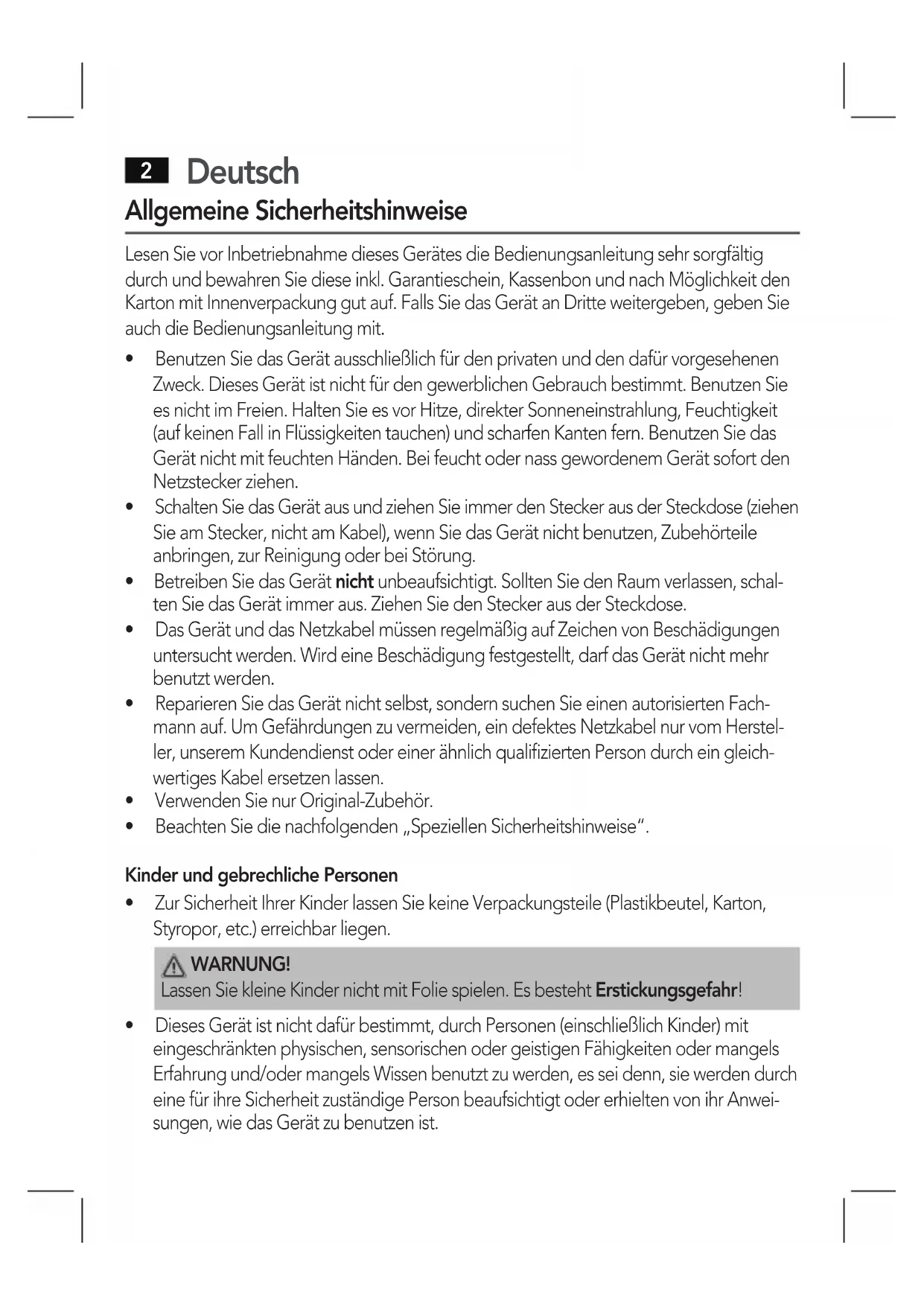 Dieses Gerät ist nicht damit bestimmt, durch Personen (einschließlich Kinder) mit eingeschränkten physischen, sensorischen oder geistigen Fähigkeiten oder mangels Erfahrung und/oder mangels Wissen benutz zu werden, es sei dann, sie werden durch eine für ihre Sicherheit zuständige Person beaufsichtigt oder erhielten von ihr Anweisungen, wie das Gerät zu benutzen ist.