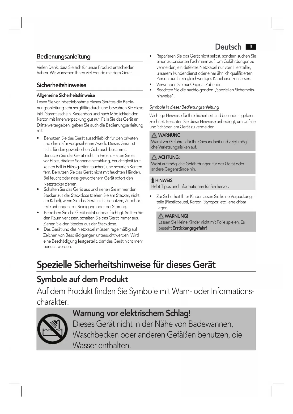 - Benutzen Sie das Gerät ausschließlich für den privaten und den darauf vorgesehenen Zweck. Dieses Gerät ist nicht für den gewerblichen Gebrauch bestimmt. Benutzen Sie das Gerät nicht im Freien. Halten Sie es vor Hitze, direkter Sonneneinstzahlung, Feuchtigkeit (auf keinen Fall in Flüssigkeiten tauchen) und scharfen Kanten fern. Benutzen Sie das Gerät nicht mit feuchten Händen. Bei feucht oder Nass gewordenem Gerät sofort den Netzsteckerziehen.