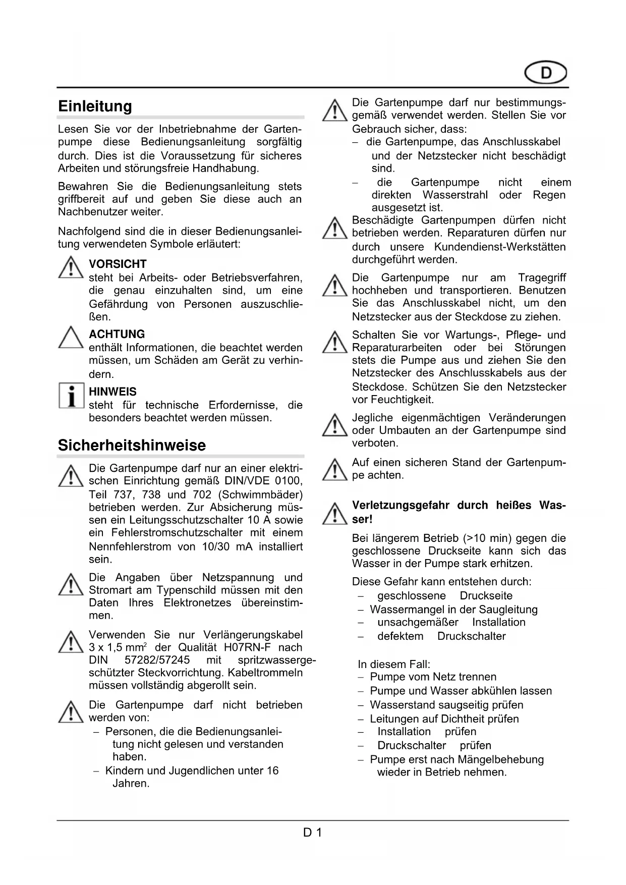 1" 1" 1" 6,4 kg netto 6,2 kg netto 7,7 kg netto 7,5 kg netto 8,5 kg nettoEinleitung Lesen Sie vor der Inbetriebnahme der Garten- pumpe diese Bedienungsanleitung sorgfältig durch. Dies ist die Voraussetzung für sicheres Arbeiten und störungsfreie Handhabung. Bewahren Sie die Bedienungsanleitung stets griffbereit auf und geben Sie diese auch an Nachbenutzer weiter. Nachfolgend sind die in dieser Bedienungsanlei- tung verwendeten Symbole erläutert: VORSICHT steht bei Arbeits- oder Betriebsverfahren, die genau einzuhalten sind, um eine Gefährdung von Personen auszuschlie- ßen. ACHTUNG enthält Informationen, die beachtet werden müssen, um Schäden am Gerät zu verhin- dern. HINWEIS steht für technische Erfordernisse, die besonders beachtet werden müssen. Sicherheitshinweise Die Gartenpumpe darf nur an einer elektri- schen Einrichtung gemäß DIN/VDE 0100, Teil 737, 738 und 702 (Schwimmbäder) betrieben werden. Zur Absicherung müs- sen ein Leitungsschutzschalter 10 A sowie ein Fehlerstromschutzschalter mit einem Nennfehlerstrom von 10/30 mA installiert sein. Die Angaben über Netzspannung und Stromart am Typenschild müssen mit den Daten Ihres Elektronetzes übereinstim- men. Verwenden Sie nur Verlängerungskabel 3 x 1,5 mm