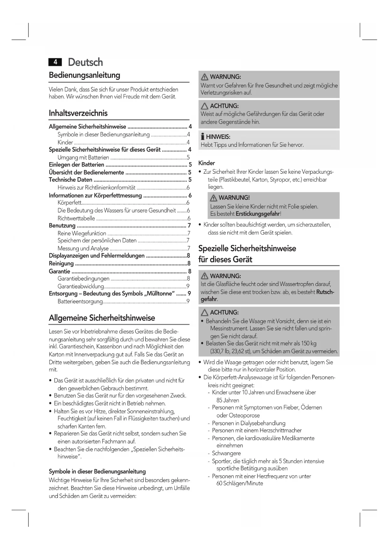 - Die Körperfett-Analysewaage ist für folgenden Personen- kreis nicht geeignet: - Kinder unter 10 Jahren und Erwachsene über 85 Jahren - Personen mit Symptomen von Fieber, Ödemen oder Osteoporose - Personen in Dialysebehandlung - Personen mit einem Herzschrittmacher - Personen, die kardiovaskuläre Medikamente einnehmen - Schwangere - Sportler, die täglich mehr als 5 Stunden intensive sportliche Betätigung ausüben - Personen mit einer Herzfrequenz von unter 60 Schlägen/MinuteDeutsch