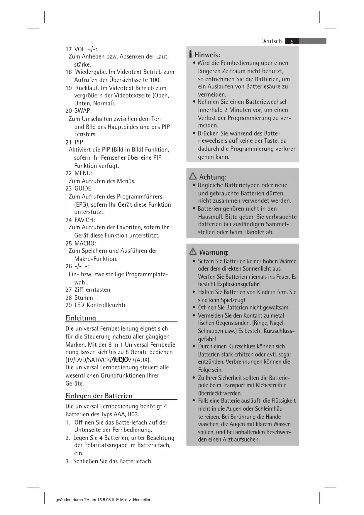 geändert durch TH am 15.5.08 lt. E-Mail v. Hersteller.Programmierung der Fernbedienung