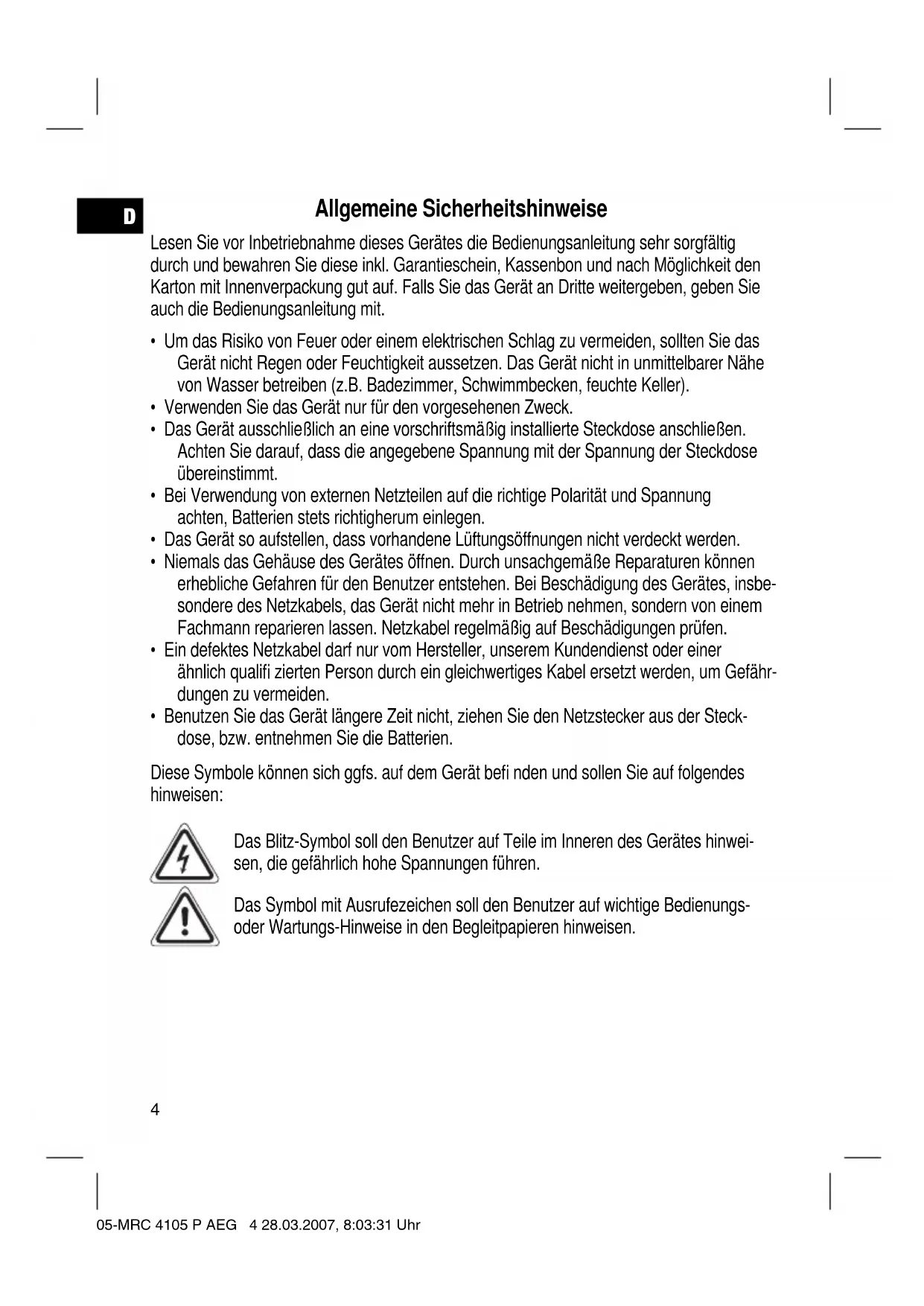 • Tauchen Sie das Gerät nicht ins Wasser. 05-MRC 4105 P AEG 8 28.03.2007, 8:03:37 UhrD