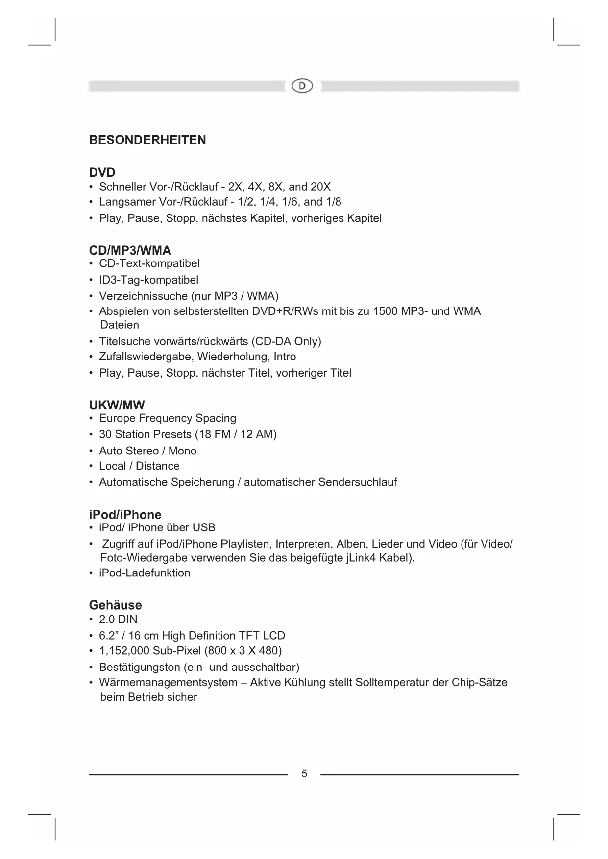 - Zugriff auf iPod/iPhone Playlisten, Interpreten, Alben, Lieder und Video (für Video/ Foto-Wiedergabe verwenden Sie das beigefügte jLink4 Kabel).