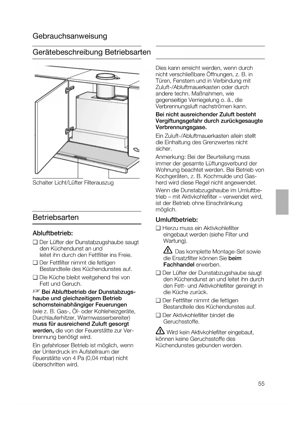 Bei Abluftbetrieb der Dunstabzugs- haube und gleichzeitigem Betrieb schornsteinabhängiger Feuerungen (wie z. B. Gas-, Öl- oder Kohleheizgeräte, Durchlauferhitzer, Warmwasserbereiter) muss für ausreichend Zuluft gesorgt werden, die von der Feuerstätte zur Ver- brennung benötigt wird. Ein gefahrloser Betrieb ist möglich, wenn der Unterdruck im Aufstellraum der Feuerstätte von 4 Pa (0,04 mbar) nicht überschritten wird. Dies kann erreicht werden, wenn durch nicht verschließbare Öffnungen, z. B. in Türen, Fenstern und in Verbindung mit Zuluft-/Abluftmauerkasten oder durch andere techn. Maßnahmen, wie gegenseitige Verriegelung o. ä., die Verbrennungsluft nachströmen kann. Bei nicht ausreichender Zuluft besteht Vergiftungsgefahr durch zurückgesaugte Verbrennungsgase. Ein Zuluft-/Abluftmauerkasten allein stellt die Einhaltung des Grenzwertes nicht sicher. Anmerkung: Bei der Beurteilung muss immer der gesamte Lüftungsverbund der Wohnung beachtet werden. Bei Betrieb von Kochgeräten, z. B. Kochmulde und Gas- herd wird diese Regel nicht angewendet. Wenn die Dunstabzugshaube im Umluftbe- trieb – mit Aktivkohlefilter – verwendet wird, ist der Betrieb ohne Einschränkung möglich. Umluftbetrieb: ❑ Hierzu muss ein Aktivkohlefilter eingebaut werden (siehe Filter und Wartung). Das komplette Montage-Set sowie die Ersatzfilter können Sie beim Fachhandel erwerben. ❑ Der Lüfter der Dunstabzugshaube saugt den Küchendunst an und leitet ihn durch den Fett- und Aktivkohlefilter gereinigt in die Küche zurück. ❑ Der Fettfilter nimmt die fettigen Bestandteile des Küchendunstes auf. ❑ Der Aktivkohlefilter bindet die Geruchsstoffe. Wird kein Aktivkohlefilter eingebaut, können keine Geruchsstoffe des Küchendunstes gebunden werden. Gebrauchsanweisung Schalter Licht/Lüfter Filterauszug56 Vor dem ersten Benutzen Wichtige Hinweise: ❑ Diese Gebrauchsanweisung gilt für mehrere Geräte-Ausführungen. Es ist möglich, dass einzelneAusstattungsmerkmale beschriebensind, die nicht auf Ihr Gerät zutreffen.❑ Diese Dunstabzugshaube entspricht deneinschlägigen Sicherheitsbestimmungen.Reparaturen dürfen nur von Fachkräftendurchgeführt werden.Durch unsachgemäße Reparaturen können erhebliche Gefahren für denBenutzer entstehen. Unter der Dunstabzugshaube nicht flambieren.Brandgefahr am Fettfilter durch ! aufsteigende Flammen. Über einer Feuerstätte für feste Brennstoffe (Kohle, Holz und dgl.) ist derBetrieb der Dunstabzugshaube nur bedingtgestattet (siehe Montageanweisung).Gas-Kochmulden / Gas-Herde Gas-Kochstellen immer sachgemäß benutzen. Wichtig: Die Flammen der Gas-Kochstellen müssenimmer mit Kochgeschirr abgedeckt sein.Durch die starke Hitzeentwicklungder offenen Gasflammen könnte die ! Dunstabzugshaube beschädigt werden. ❑ Bevor Sie das neue Gerät benutzen,lesen Sie bitte sorgfältig die Gebrauchsanweisung. Sie enthält wichtige Informationen für IhreSicherheit sowie zum Gebrauch und zurPflege des Gerätes.❑ Bewahren Sie die Gebrauchs- und Montageanweisung ggf. für einen Nachbesitzer gut auf. Ist das Gerät beschädigt, dürfen Sie es nicht in Betrieb nehmen. Anschluss und Inbetriebnahme dürfen nur von einem Fachmann durchgeführt werden. Wenn die Anschlussleitung dieses Gerätes beschädigt wird, muss sie durchden Hersteller oder seinen Kundendienstoder eine ähnlich qualifizierte Person ersetztwerden, um Gefährdung zu vermeiden. Verpackungsmaterial ordnungsgemäß entsorgen (siehe Montageanweisung). Dunstabzugshaube nur mit eingesetzten Lampen betreiben. Defekte Lampen sollten sofort ersetzt werden, um Überlastung der restlichenLampen zu vermeiden. Dunstabzugshaube nie ohne Fettfilter betreiben. Überhitzte Fette oder Öle können sich leicht entzünden.Darum Speisen mit Fetten oder Ölen, z. B. Pommes frites, nur unter Aufsichtzubereiten.57 Bedienen der Dunstabzugshaube Der Küchendunst wird am wirkungs- vollsten beseitigt durch: ❑ Einschalten der Dunstabzugshaube bei Kochbeginn. ❑ Ausschalten der Dunstabzugshaube erst einige Minuten nach Kochende. Lüfter – Aus – Beleuchtung Aus / Ein Intensivstufe Lüfterstufen Lüfter – Aus – Intensivstufe Reset-Taste mit Sättigungsanzeige für Fettfilter Lüfterstufen Beleuchtung Aus / Ein Ausschalten: Die Dunstabzugshaube lässt sich auf verschiedene Arten ausschalten. Ausschalten 1: